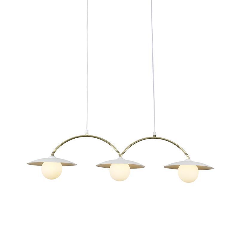 Závěsné svítidlo ACA Lighting FLERIA v třísvětelné variantě představuje elegantní spojení moderního designu a jemné retro estetiky. Kombinace bílé kovové základny se saténově mosaznými oblouky a kulovými opálovými difuzory vytváří lehký a vyvážený celek, který se přirozeně stane dominantou prostoru nad jídelním stolem, kuchyňským ostrůvkem nebo v obývacím pokoji.