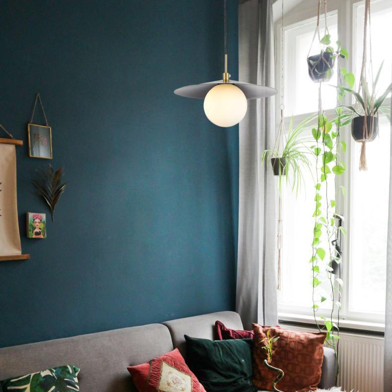 Závěsné svítidlo ACA Lighting Globie v provedení s černým kovovým stínítkem představuje elegantní kombinaci moderní estetiky a jemných retro akcentů. Kontrast matně černého talíře, opálového kulového difuzoru a detailu v barvě saténové mosazi vytváří vizuálně vyvážené svítidlo, které působí luxusně, ale zároveň střídmě.