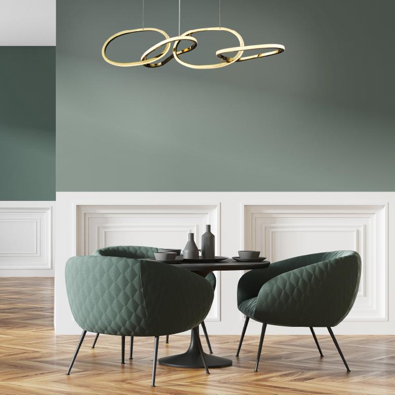 Závěsné svítidlo ACA Lighting RING HM88LEDP4GDCCT představuje moderní designový prvek, který kombinuje eleganci mosazného provedení s výrazným světelným efektem. Čtyři vzájemně propletené kruhy vytvářejí atraktivní prostorovou kompozici a díky nepřímému vyzařování poskytují příjemné, rovnoměrné osvětlení bez oslnění.