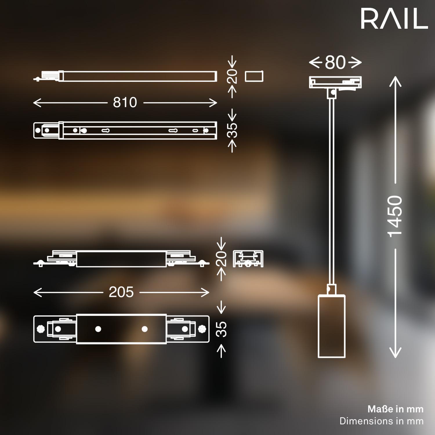 • Kompletní sada: 2x lišta 75 cm (celkem 1,5 m), 4x závěsná LED svítidla (5,5 W, 3000K teplá bílá), napájení, spojky a koncovky