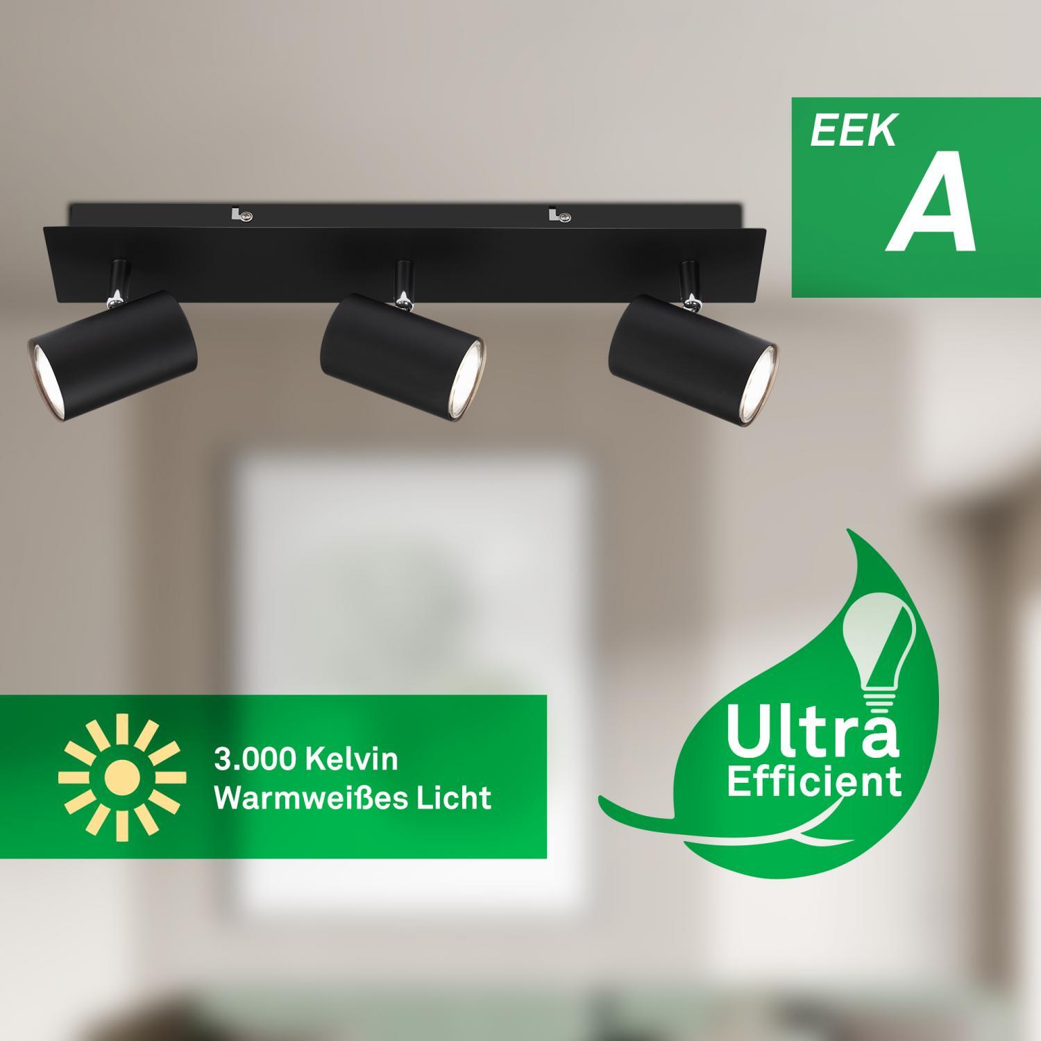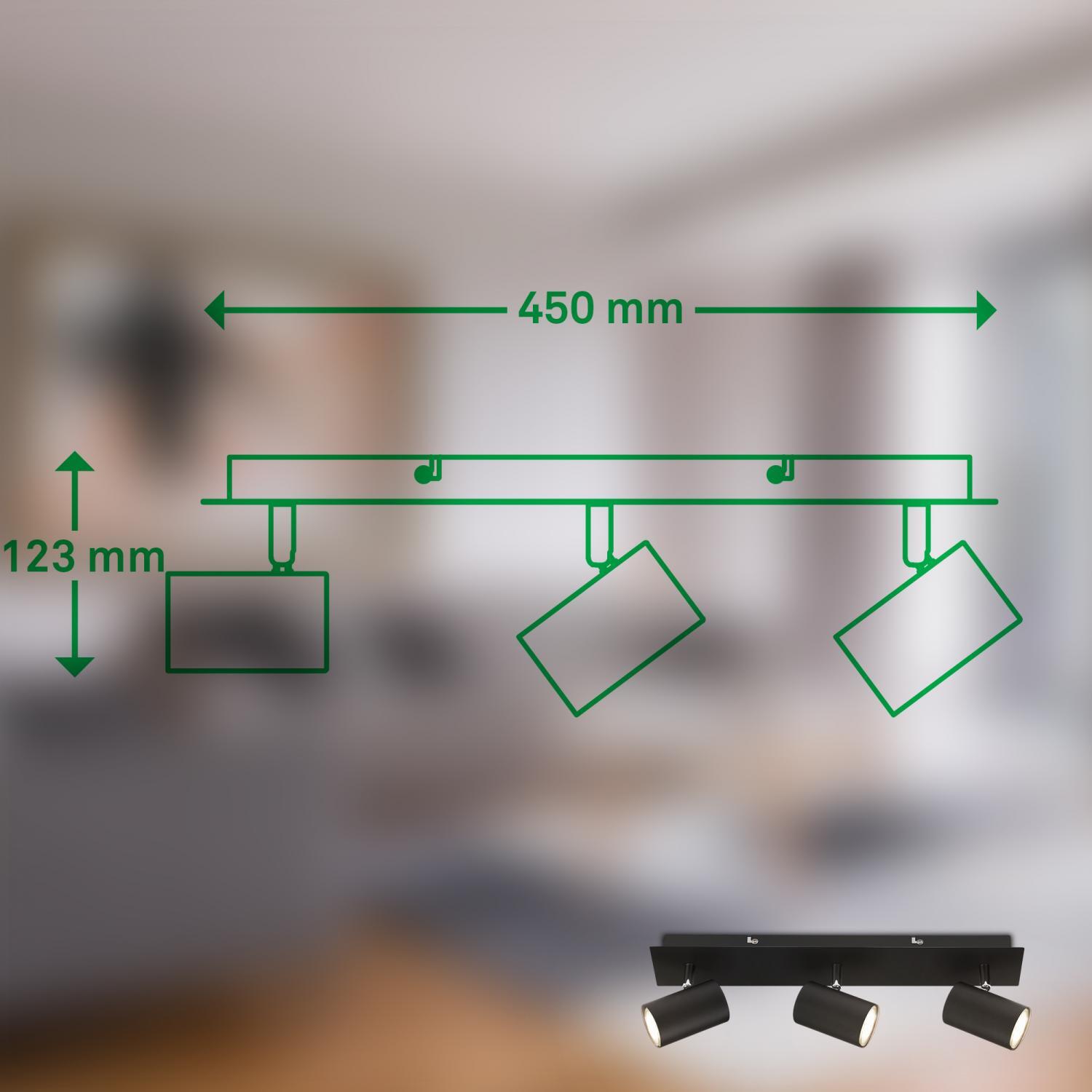 Výška: 125 mm, Životnost: 50000h, Šířka: 80mm, Délka: 450mm, Ochrana IP: IP20, Barva světla: 3000K, Patice: GU10, Vč. světelného zdroje: ano, Materiál: kov, Barva: černá, Počet světelných zdrojů: 3