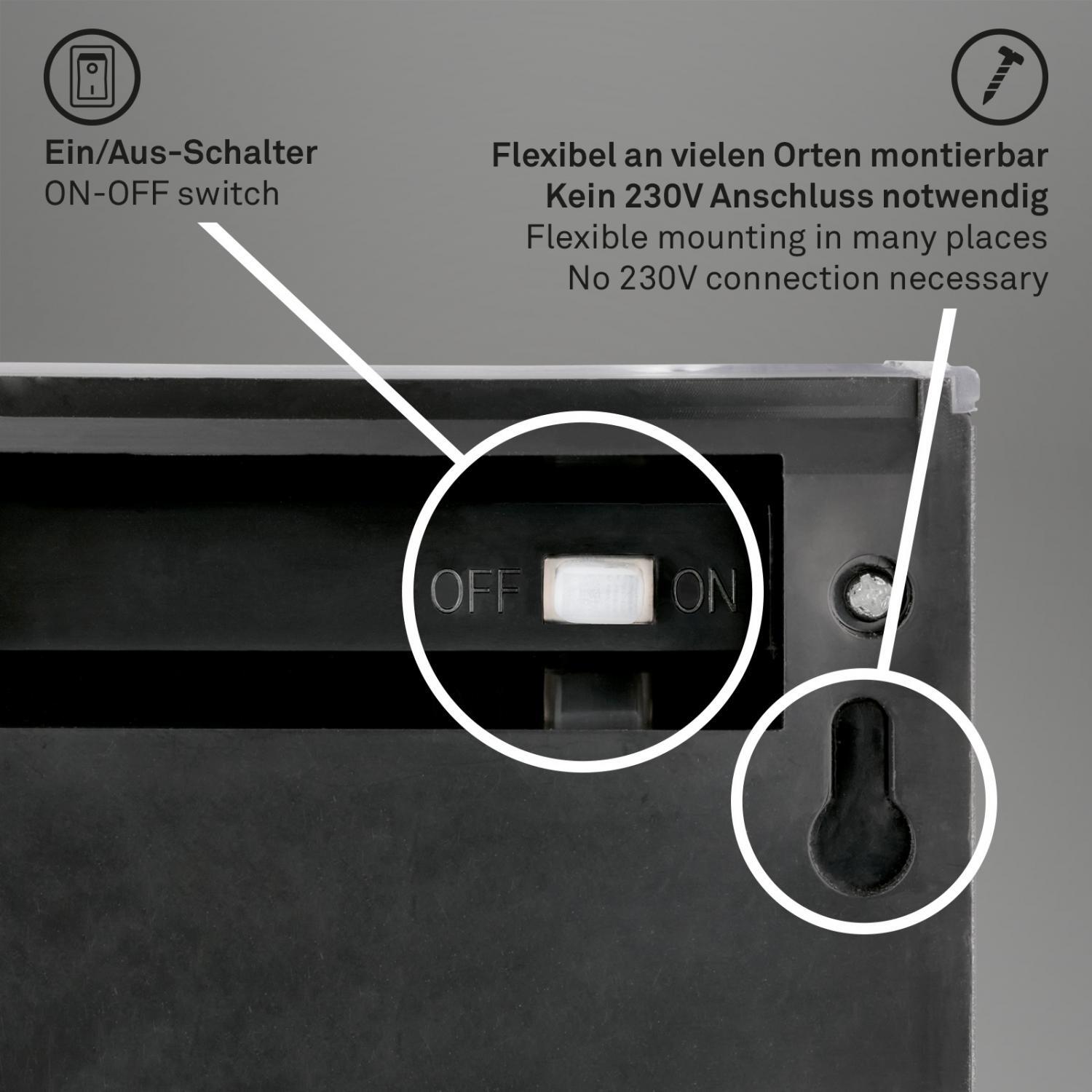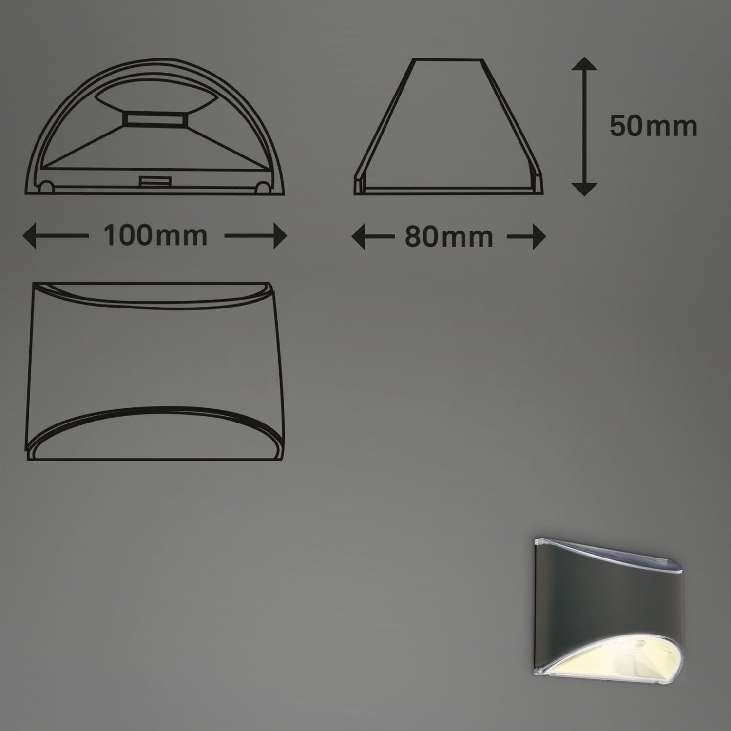 Výška: 50 mm, Šířka: 80mm, Délka: 100mm, Barva světla: 3000K, Patice: LED, Vč. světelného zdroje: ano, Materiál: plast, Barva: antracit, Počet světelných zdrojů: 1