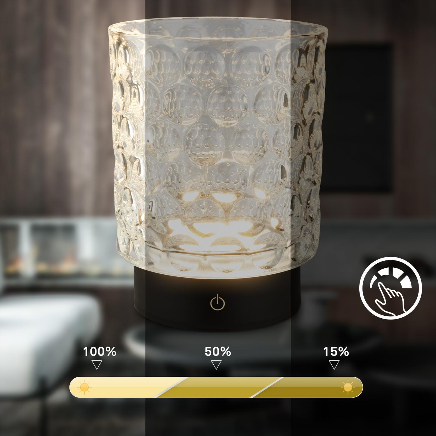 Výška: 150mm, Průměr: 110mm, Ochrana IP: IP44, Barva světla: 2700K, Patice: LED, Vč. světelného zdroje: ano, Materiál: sklo / plast, Barva: průhledná / černá, Počet světelných zdrojů: 1