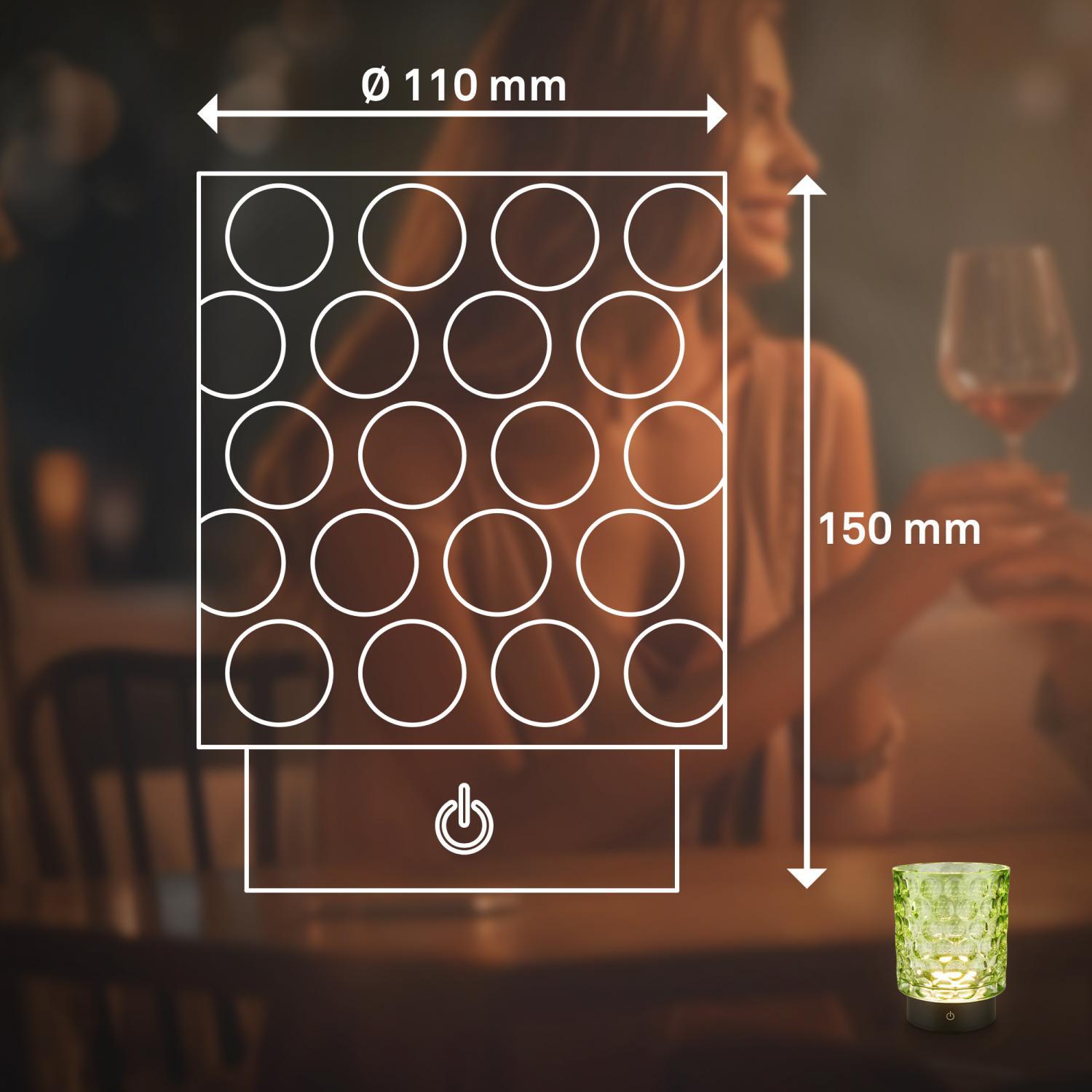 Výška: 150mm, Průměr: 110mm, Ochrana IP: IP44, Barva světla: 2700K, Patice: LED, Vč. světelného zdroje: ano, Materiál: sklo / plast, Barva: zelená, Počet světelných zdrojů: 1