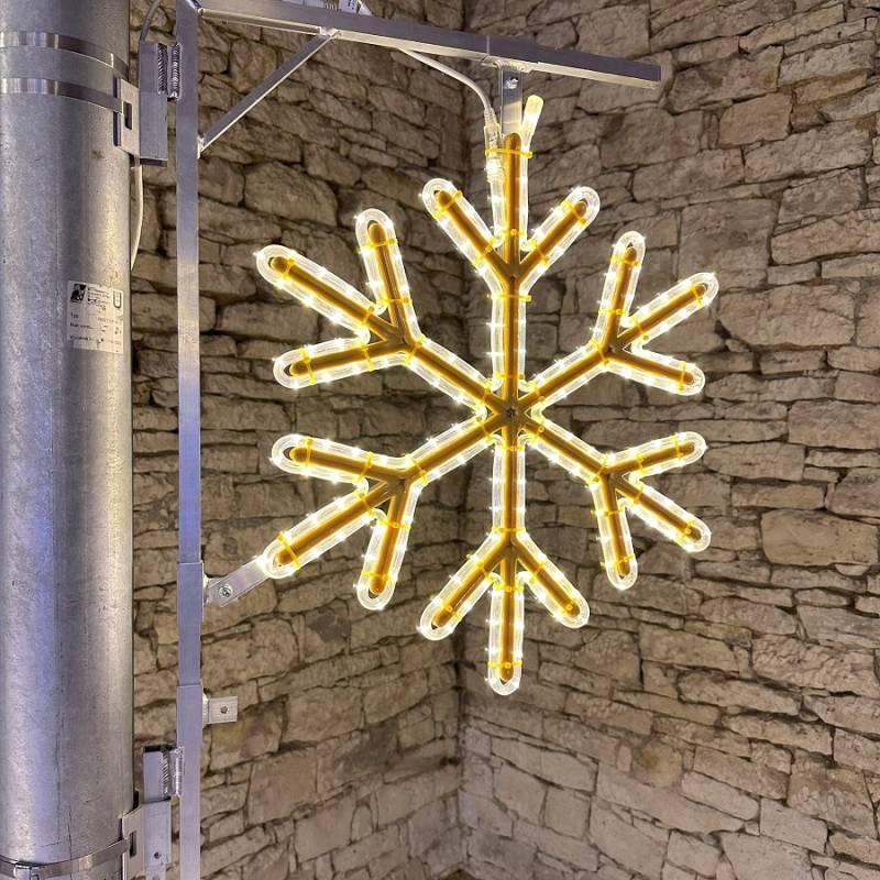 LED světelná vločka DecoLED VI představuje moderní a mimořádně působivý dekorativní prvek pro veřejné osvětlení, fasády, štíty rodinných domů, ploty, balkony či terasy. Díky technologii 3D tisku je vločka nejen tvarově precizní, ale také lehká a odolná vůči povětrnostním vlivům.