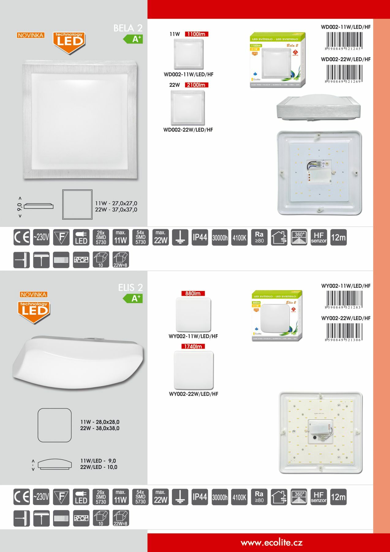 Nástěnné a stropní svítidlo BELA 2 s modelovým označením WD002-11W/LED/HF nebo 22W/LED/HF je vyrobeno z kovu a plastu a má charakteristický vypouklý kryt. Je vybaveno HF senzorem pohybu s úhlem pokrytí celých 360? a dosahem až 12 metrů při montážní výšce 2,5m. Využívá vysoce úspornou LED technologii s čipem SMD5730. Díky vyššímu krytí lze umístit i do exteriérů na strop i stěnu. Využití najde např: chodby paneláků, WC, schodiště, sklepy, vchody do budov, obchody, nemocnice, sklady, úřady, osvětlení vchodových dveří, předsíní atd.Senzor pohybu: HF čidlo pohybu funguje na principu mikrovln, které detekují pohyb i přes sklo a lehké stavební materiály.