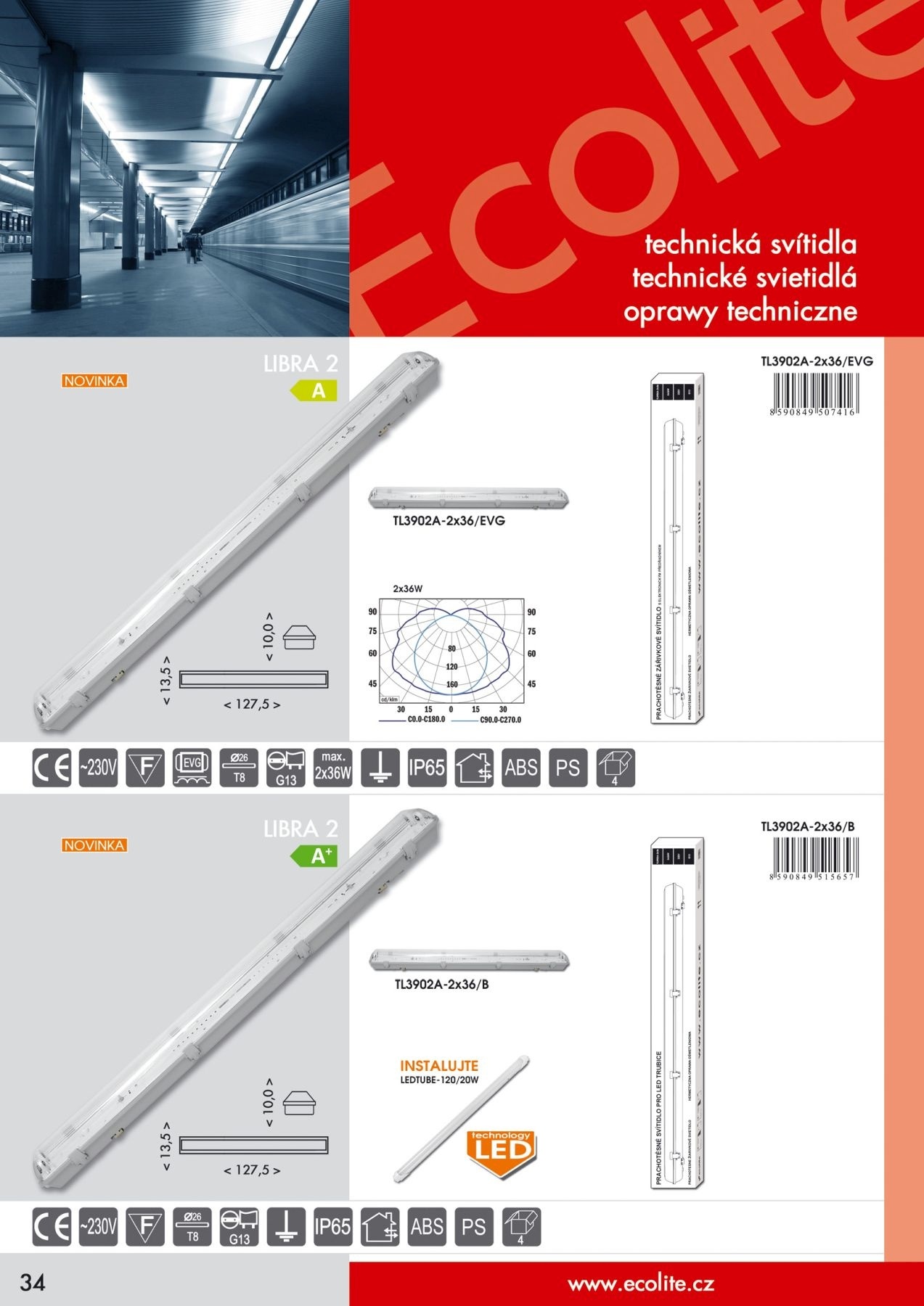 Rozměry: 127,5 x 13,5 x 10cm, Napájení [V]: 220-240, Max. výkon [W]: 2x 36, Patice/objímka: G13, Předřadník: elektronický (EVG), Materiál: ABS, polystyren, Barva produktu: bílá, šedá, Stupeň krytí IP: 65, Třída ochrany: I, Předinstalovaný zdroj: ne (2x T8, 26mm)