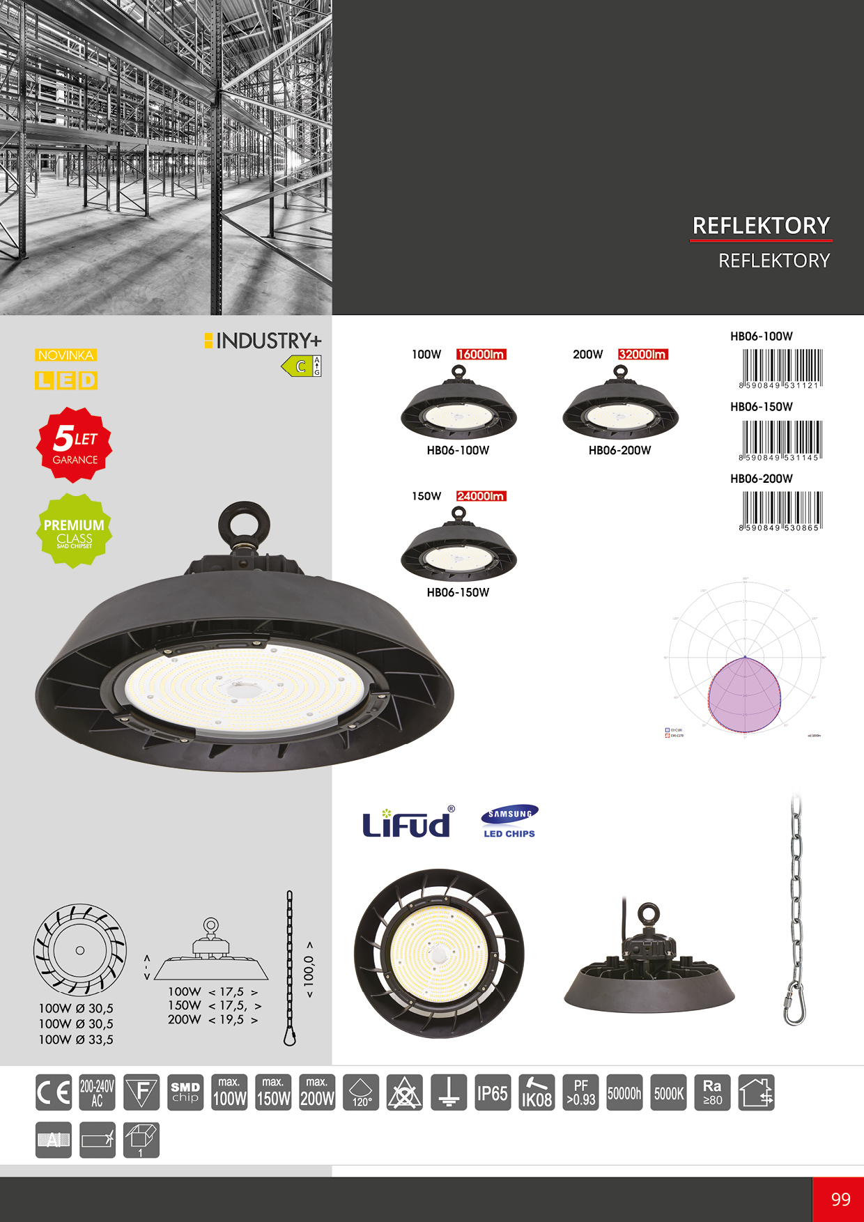 Masivní LED průmyslové svítidlo INDUSTRY+ se svým výkonem a zpracováním řadí do kategorie high bay svítidel, která jsou nejvhodnějším řešením pro osvětlení výrobních hal či skladovacích prostor s vysokým stropem. Výrobek je osazen značkovými komponenty od společností Samsung a Lifud, které spolehlivě ochrání hliníková konstrukce s tvrzeným sklem při nadstandardním krytí IP65 a IK08. S životností přes 50.000 hodin jsou výhodnější náhradou za klasické halogenové reflektory. Součástí balení je kovový 1m řetěz k montáži zavěšením.Svítidla INDUSTRY+ nabízíme v několika výkonech společně s volitelným příslušenstvím v podobě nastavitelné konzole (HB03-DRZAK) a čoček s úzkým rozptylem 60° (HB06-LENS60) a 90° (HB06-LENS90).