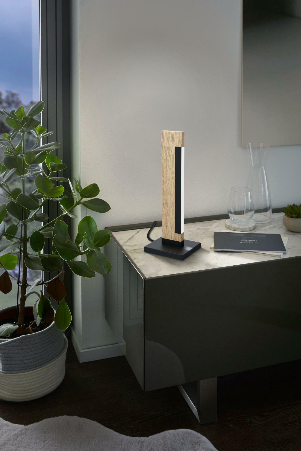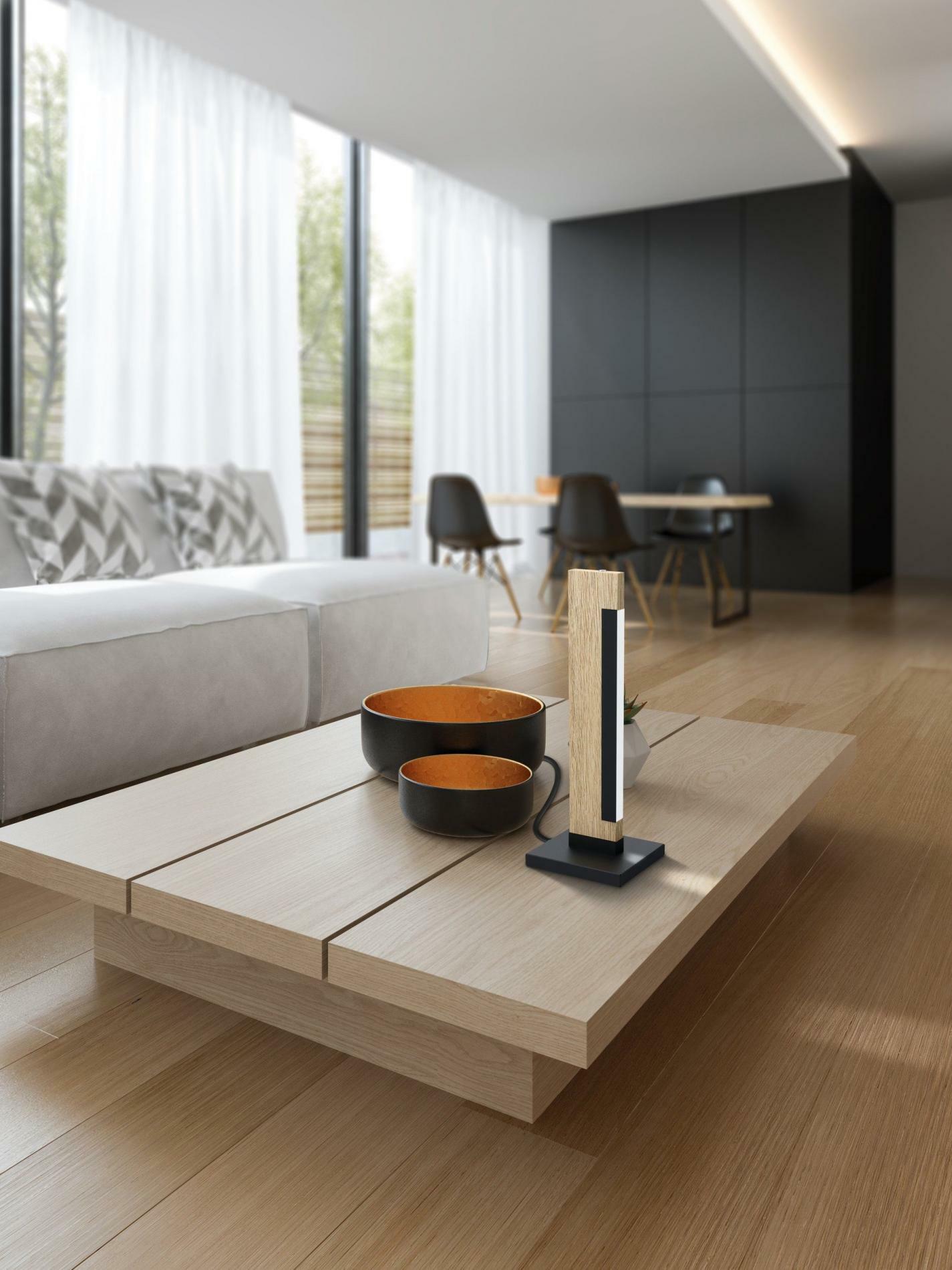 LED stolní lampa CAMACHO je elegantní kombinací černého kovu a přírodního dřeva v dekoru dubu, která je doplněna černým LED profilem. Pevně integrované LED diody vydávají příjemné teplé bílé světlo, které vytvoří útulnou atmosféru v každém interiéru. Ovládání je velmi snadné díky dotykové ploše umístěné na vrcholu lampy, kde je možné pohodlně zapínat, vypínat a stmívat světlo.