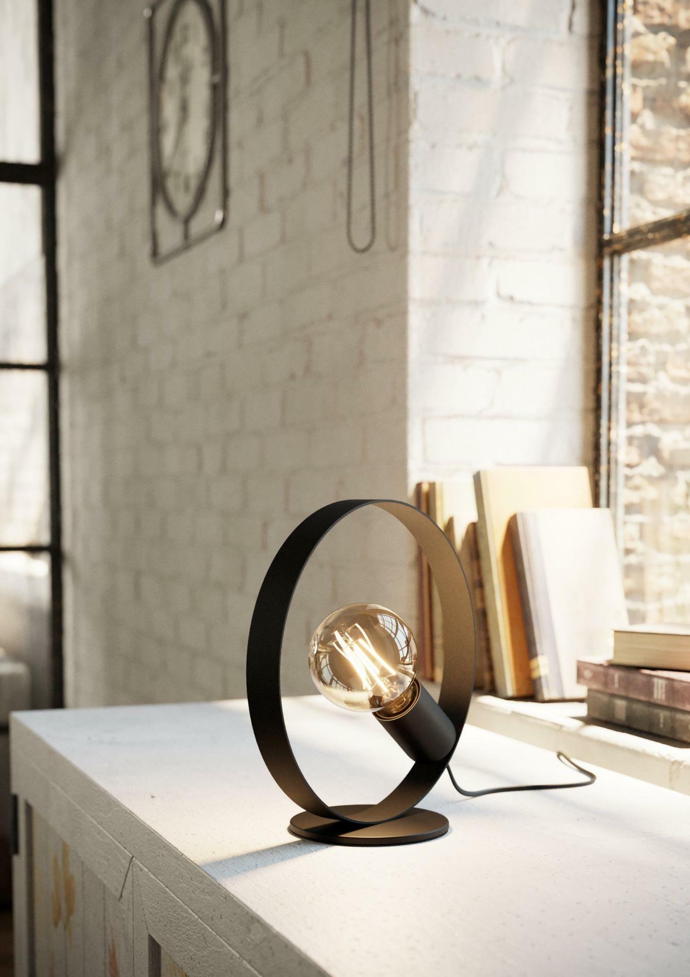 Stolní lampa FRIJOLAS je dokonalým příkladem moderního designu, který spojuje funkčnost s minimalistickou estetikou. Skládá se z černého kovového kruhu, který je v harmonii s viditelným světelným zdrojem. Unikátní vzhled lampy je podtržen šikmo umístěnou objímkou na světelný zdroj, která dodává designu jedinečný šmrnc.