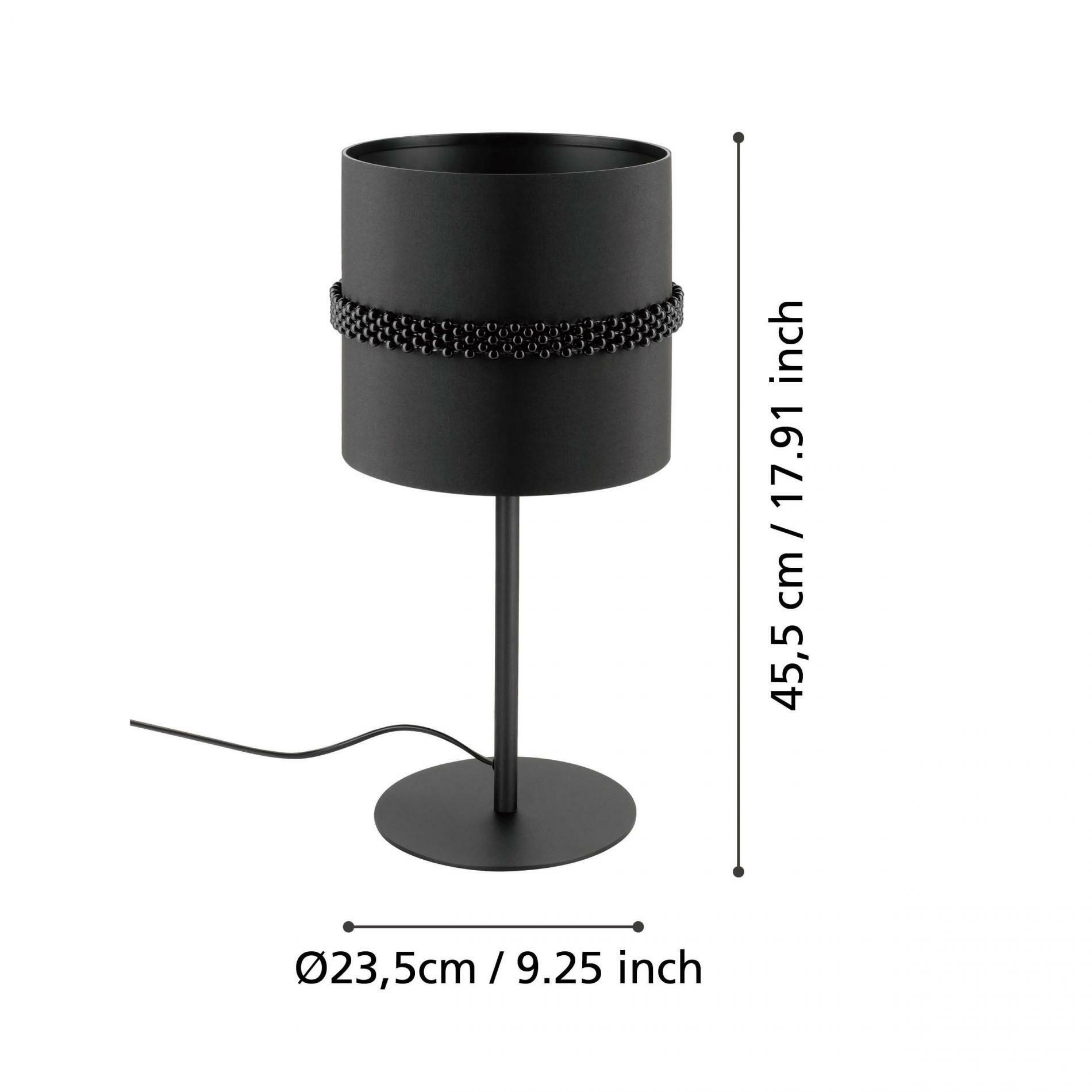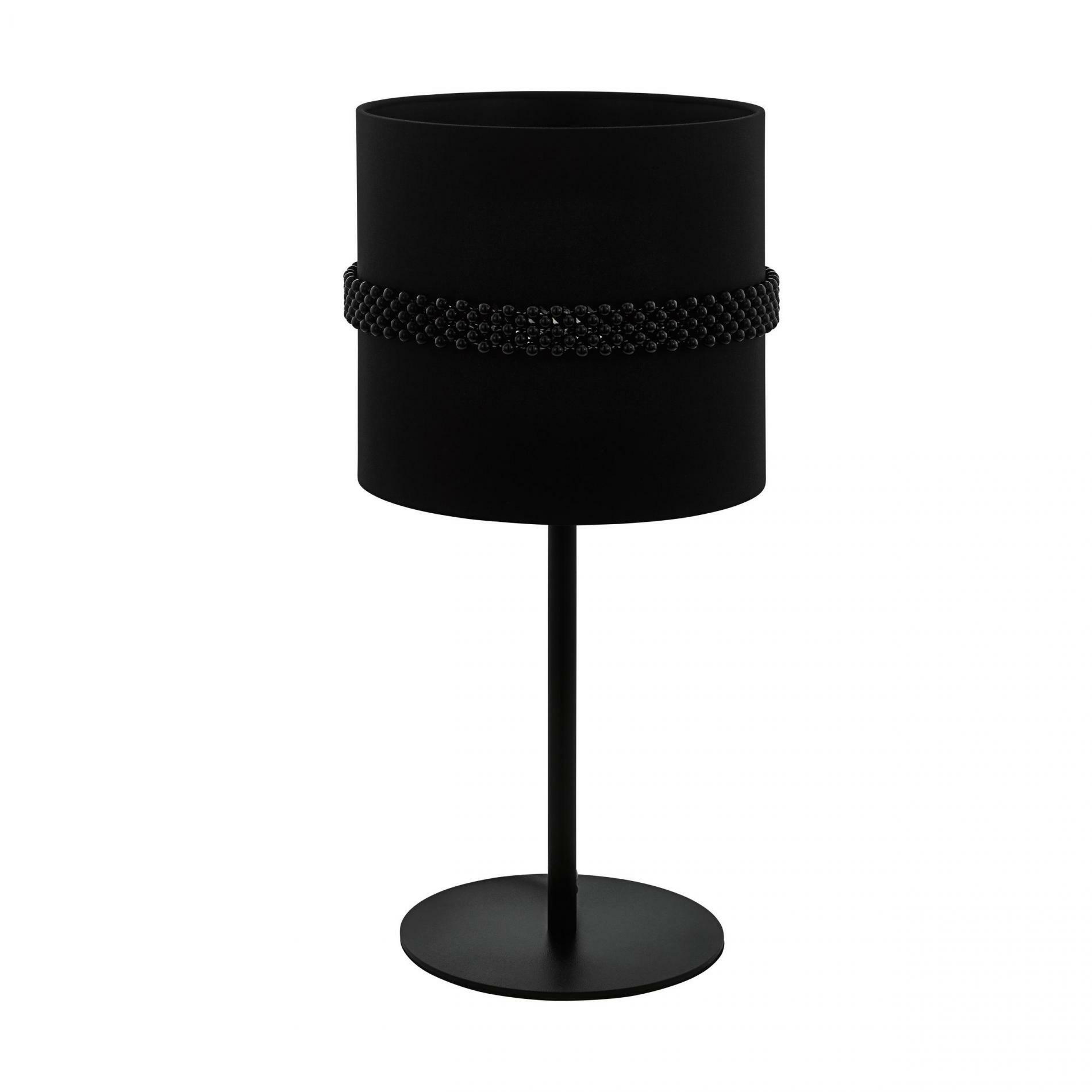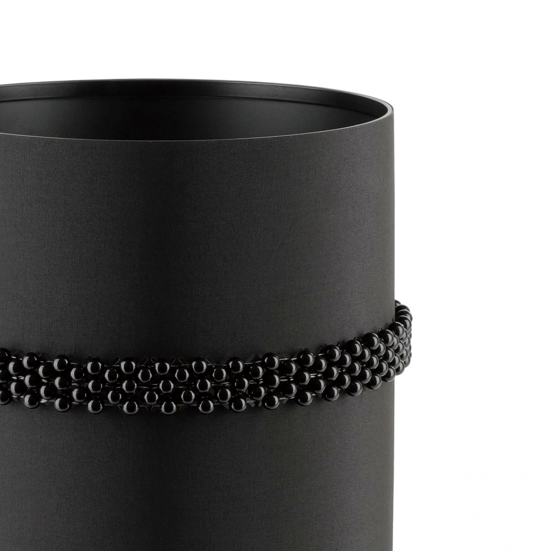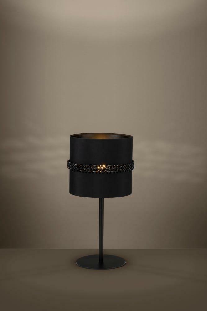 Stolní lampa PARAGUAIO vyniká elegantním designem, který kombinuje černý kovový podstavec a kulaté stínidlo z černého textilu. Jemný vzor výřezu uprostřed stínidla je obklopen decentními černými perličkami, které stylově doplňují celkový vzhled lampy.