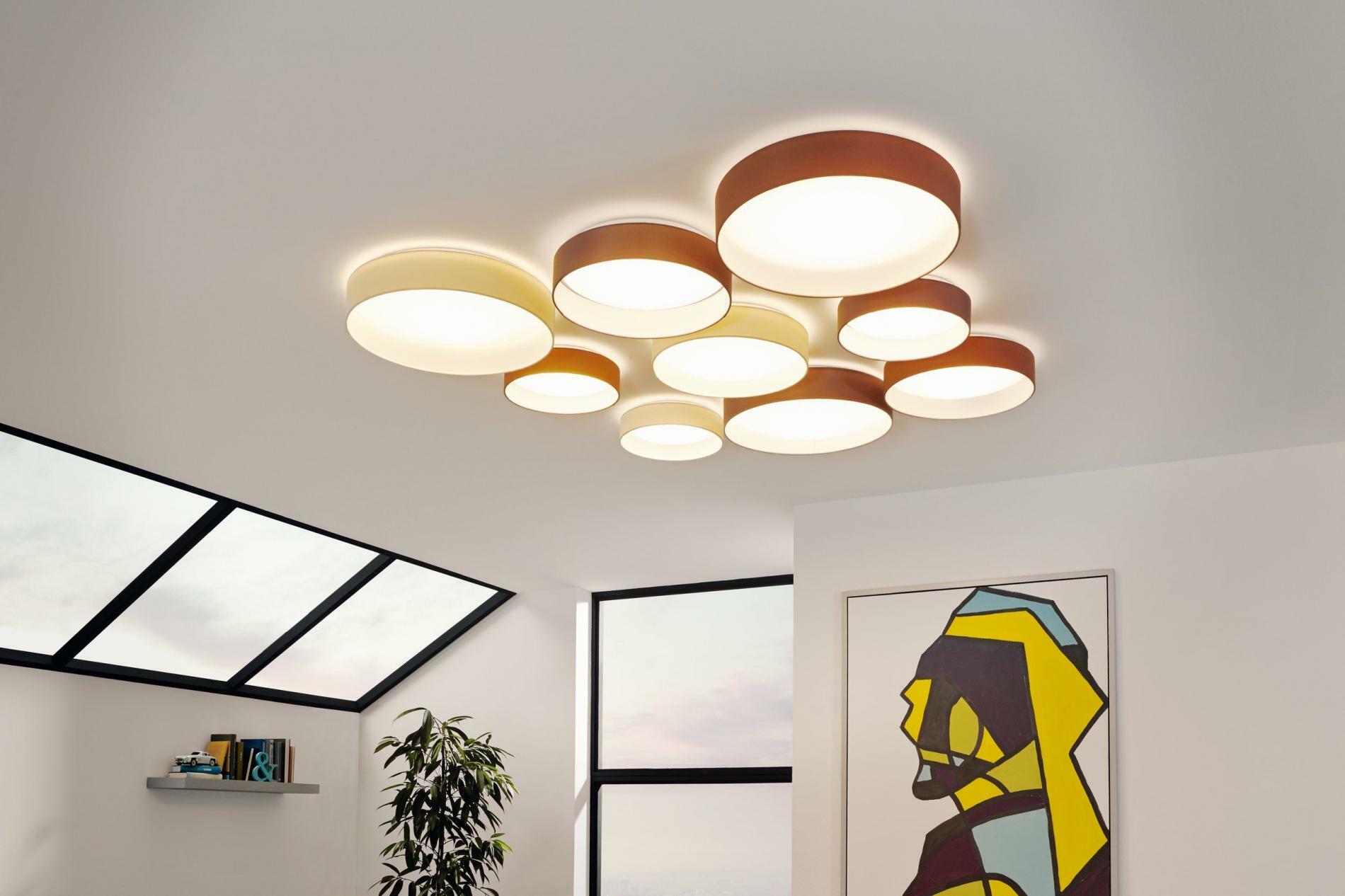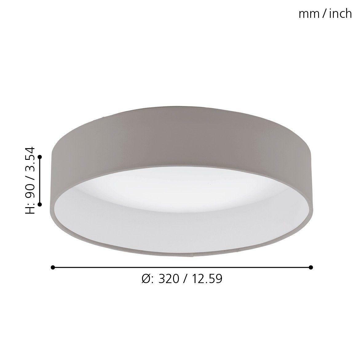 Příkon: 11W, Energetická třída: A++ - A, Světelný tok: 850 lm, Patice: LED, Zdroj světla: LED, Barva LED: teplá bílá, Zdroj součástí balení: včetně zdroje, Materiál těla: plast, Barva těla: bílá, Materiál stínidla: textil, Barva stínidla: šedohnědá, Výška: 90 mm, Průměr: 320 mm, Hmotnost: 1.204, Stupeň krytí: IP20