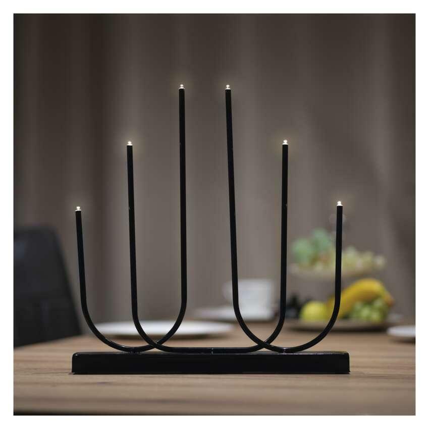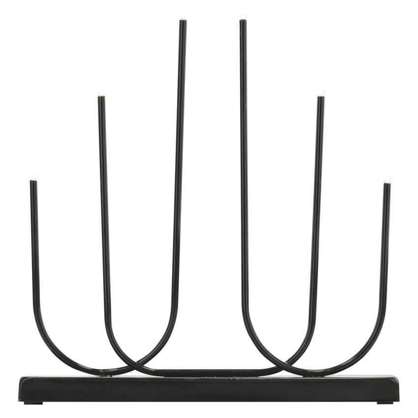 Kovový svícen v černé barvě nejlépe vynikne na světlém podkladu – umístěte jej na parapet, bílou komodu nebo stůl s přírodním dekorem dřeva. Více svícnů vedle sebe vytvoří elegantní světelnou řadu například ve vstupní hale nebo na slavnostní tabuli. V kombinaci s dalšími černými nebo zlatými doplňky dotvoří moderní i skandinávský styl interiéru.