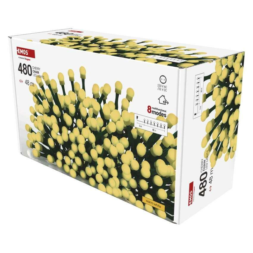 LED vánoční řetěz EMOS typu cherry s kuličkami je ideálním řešením pro slavnostní dekoraci interiéru i exteriéru. S délkou 48 metrů, 480 LED diodami a příjemnou teplou bílou barvou osvětlení navodí tu správnou sváteční atmosféru nejen na vánočním stromku do výšky až 3 m, ale také na zábradlích, oknech či v zahradě. Díky nízké spotřebě 9 W a dlouhé životnosti LED technologie můžete svítit bez obav z vysokých nákladů na provoz – 12 hodin provozu vyjde v průměru jen na 0,86 Kč.