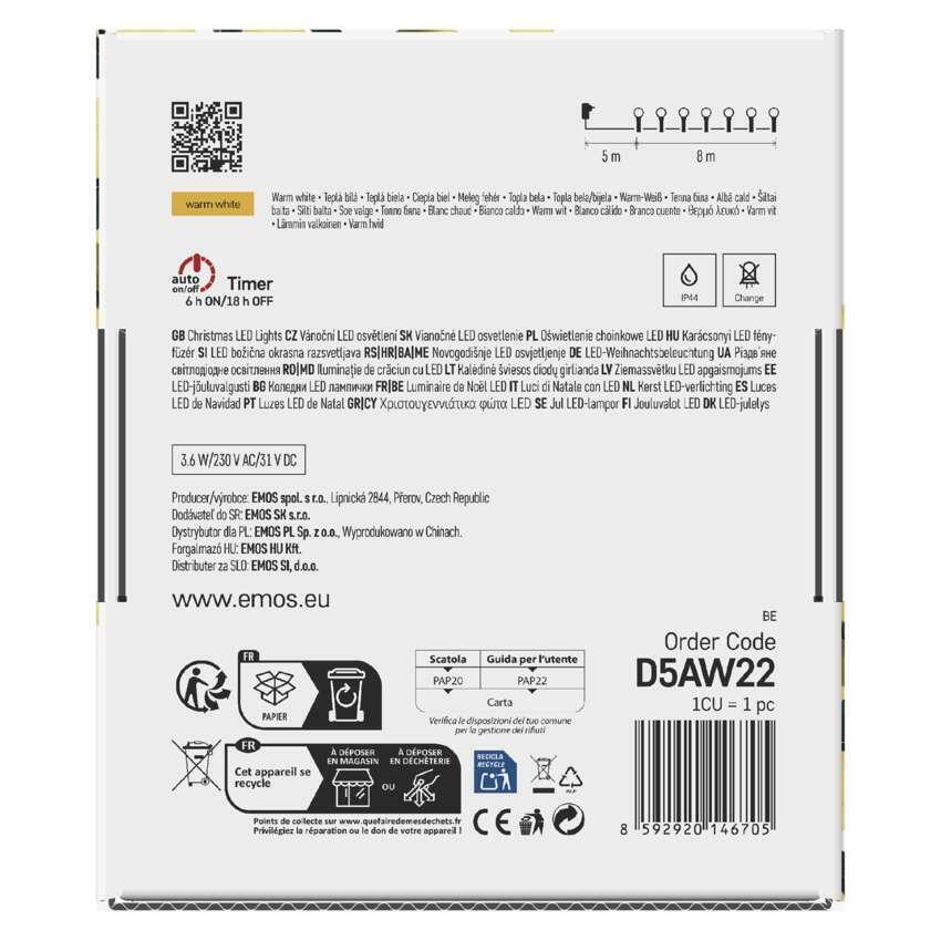 LED vánoční řetěz EMOS typu cherry (kuličky) s délkou 8 metrů je ideální volbou pro stylové a efektivní osvětlení vašeho interiéru i exteriéru. Nabízí příjemné teplé bílé světlo, které navodí útulnou atmosféru nejen o Vánocích. Svítidlo je vybaveno časovačem a programy světelných efektů, což vám umožní přizpůsobit osvětlení přesně podle vašich preferencí.