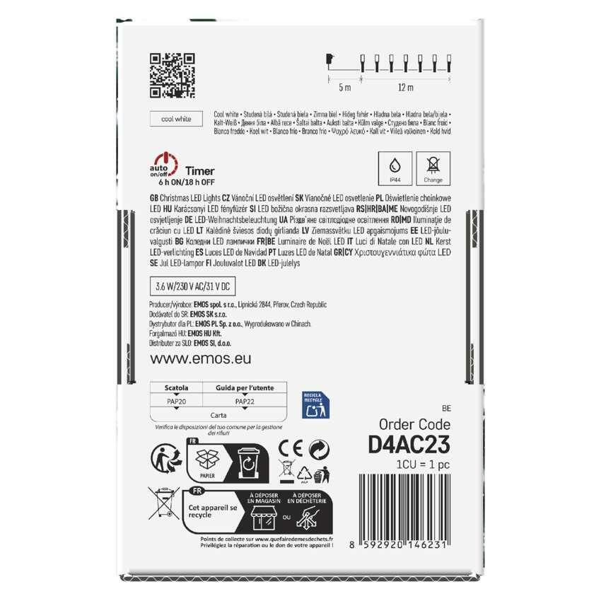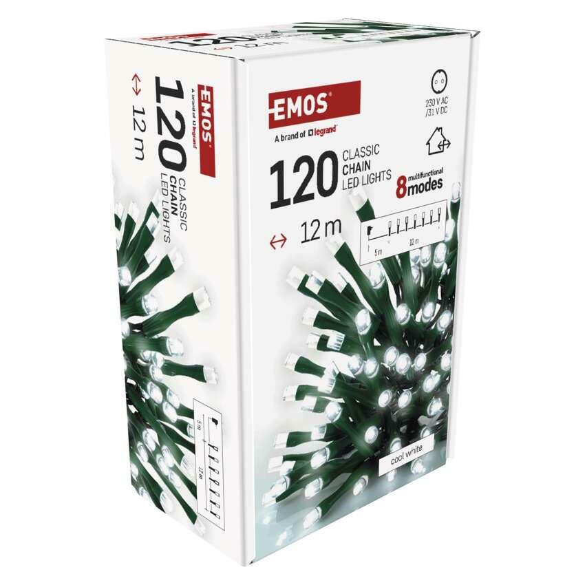 EMOS LED vánoční řetěz, 12 m, venkovní i vnitřní, studená bílá, programy, časovač D4AC23