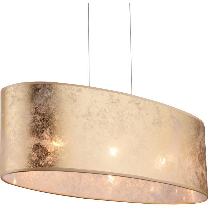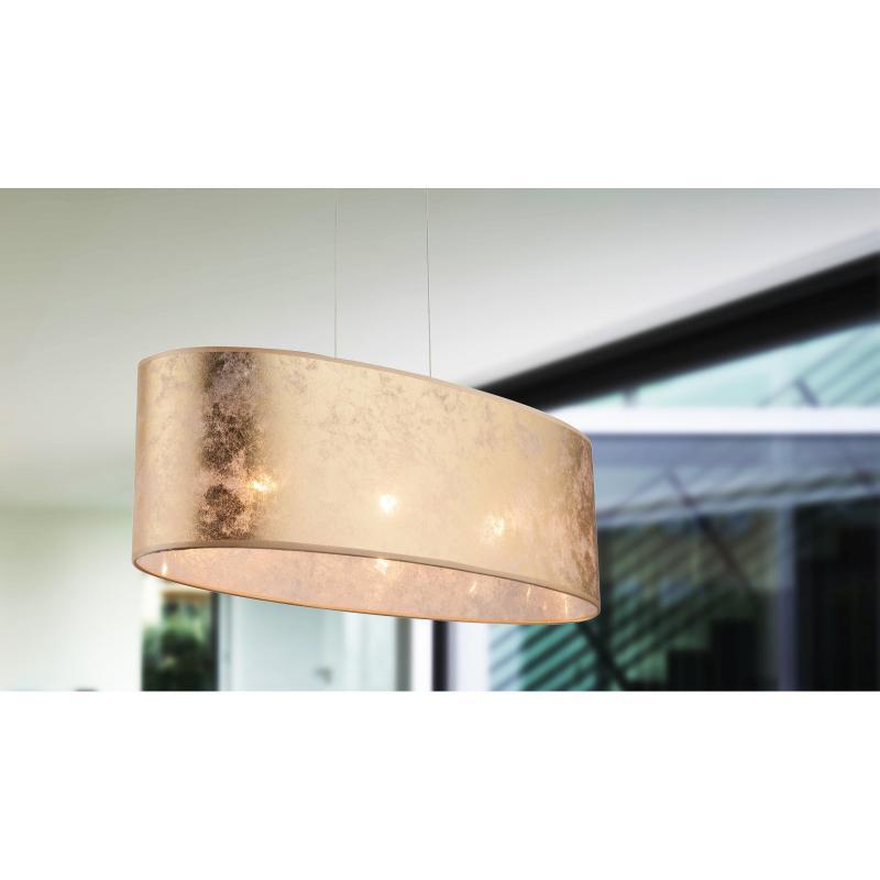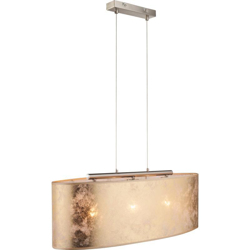 Závěsné svítidlo, kov nikl matný, plast, textil zlatý, satinovaný akryl, výška stínidla 20 cm, DxŠxV:650x250x1400, bez žárovek 3xE27, max. 60W 230V.