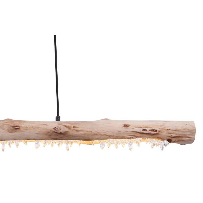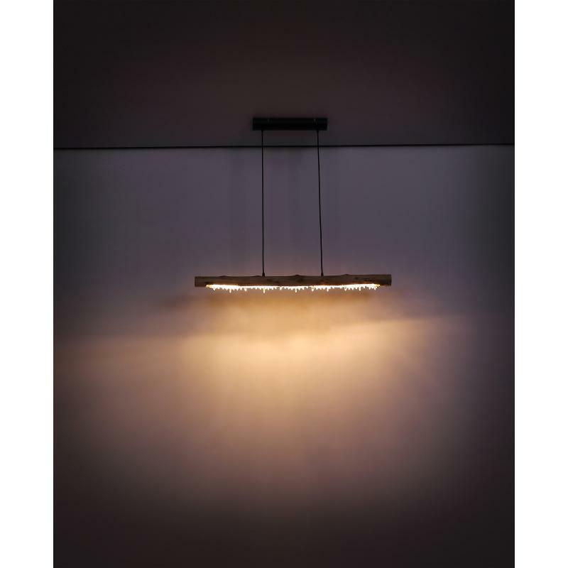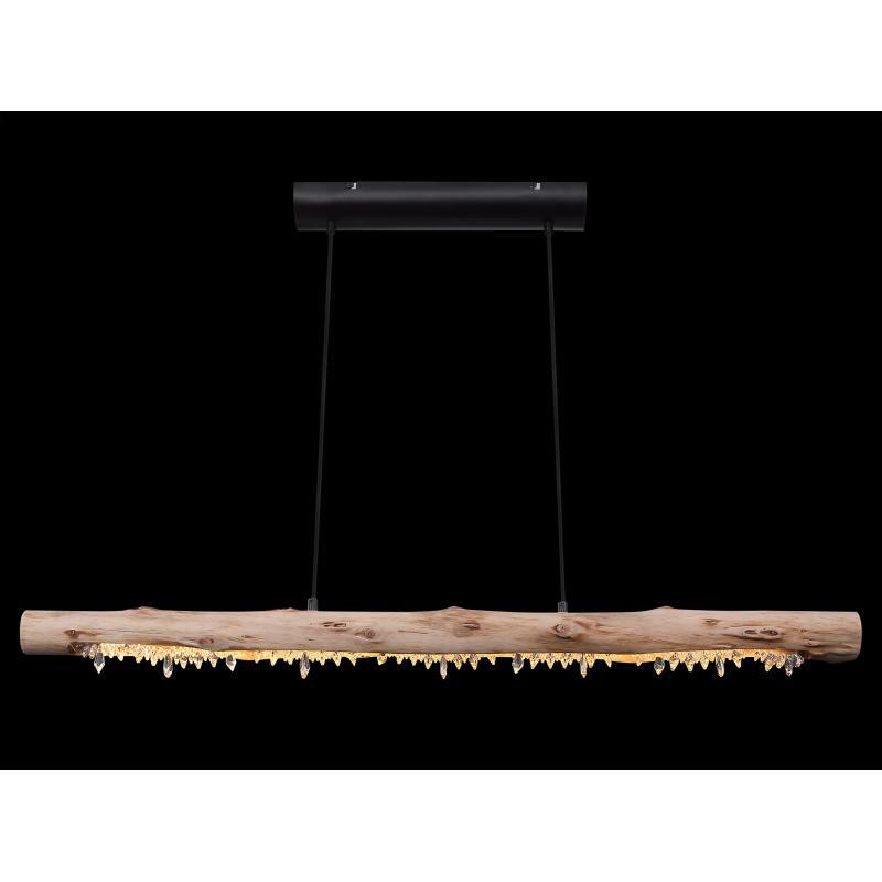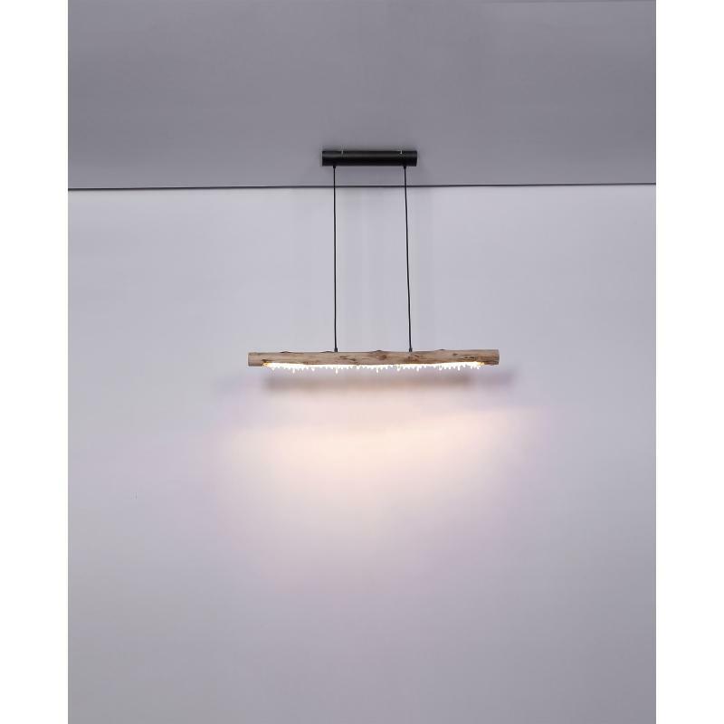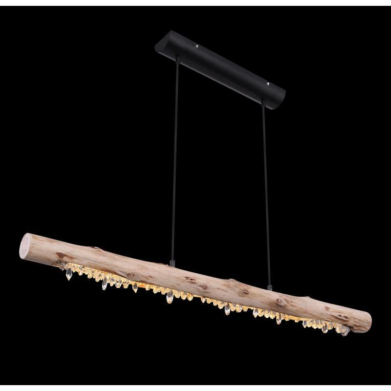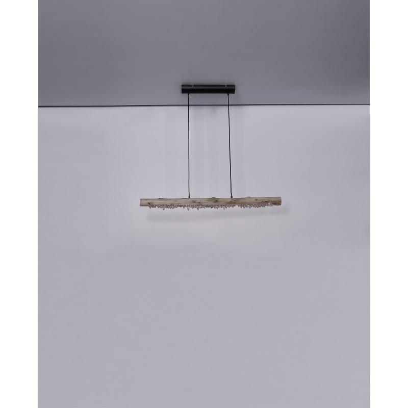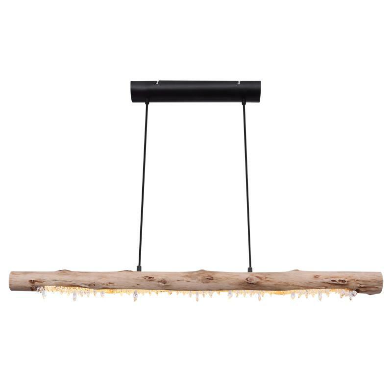 Závěsné svítidlo poskytuje velmi moderní design. Na visících černých kabelech je dřevěný trám z přírodního dřeva s akrylovými křišťály. Při instalaci lze nastavit výšku svítidla až do 150cm. Díky 15W LED zdroji poskytuje až 980 lumenů silného světla s příjemnou teplotou světla 3000 Kelvinů. Toto interiérové svítidlo se skvěle hodí do vašeho obývacího pokoje nebo jídelny.