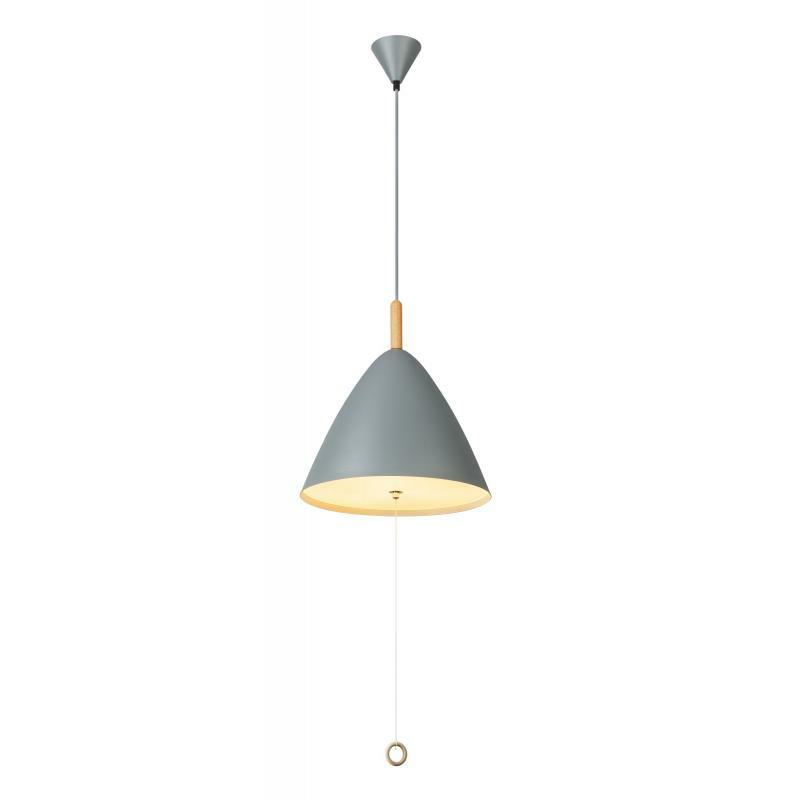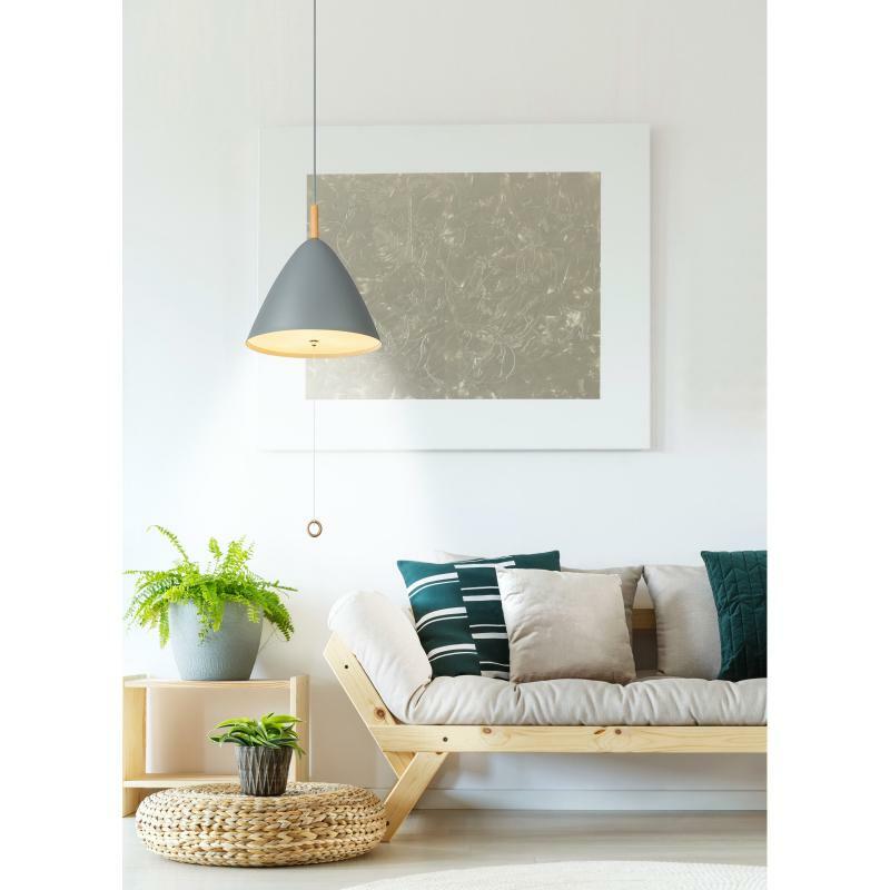 Klasické závěsné svítidlo má jednoduchý vzhled. Šedé kovové stínítko má průměr 33 cm. Ve spodní části je skleněný kryt, který tlumí světlo. Uprostřed svítidla se nachází tahový vypínač, pomocí kterého můžete zapnout a vypnout světlo. Svítidlo má tři objímky E27, díky kterým si můžete vybrat žárovky do 60W a určit si intenzitu a barvu světla.