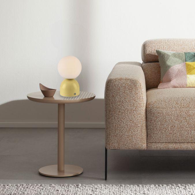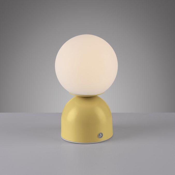 Lampa má tvar inspirovaný květem - kulové opálové sklo na žlutém podstavci působí elegantně a hravě zároveň. Kompaktní rozměry (výška 200 mm, průměr 120 mm) umožňují snadné umístění i do menších prostor. Skleněné stínidlo zajišťuje měkké rozptýlené světlo, kovový podstavec dodává stabilitu a barevný akcent.