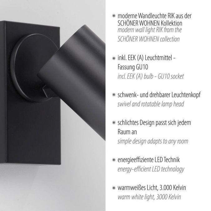 Moderní LED bodové světlo RIK v černém provedení je určeno pro montáž na stěnu nebo strop v interiéru. Díky otočné a výklopné hlavici umožňuje přesné nasměrování světla, což je ideální pro zvýraznění konkrétních míst nebo objektů v prostoru. Světlo poskytuje příjemné teplé bílé osvětlení (3000 K), které navozuje útulnou atmosféru například v chodbě, obývacím pokoji nebo ložnici. Hlavní výhodou je kombinace úsporného provozu a flexibilního použití.
