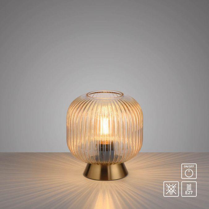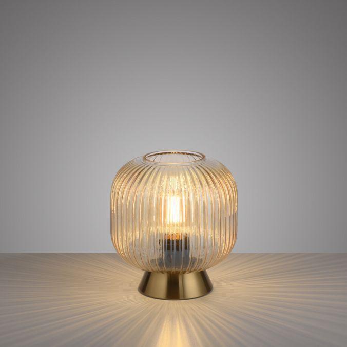 Lampa má kulatý tvar s jemně žebrovaným skleněným stínidlem v jantarovém odstínu, které stojí na nízkém podstavci v mosazné barvě. Kombinace skla a kovu působí elegantně a nadčasově. Jantarové sklo zajišťuje měkké, rovnoměrné rozptýlení světla a vytváří útulnou atmosféru.