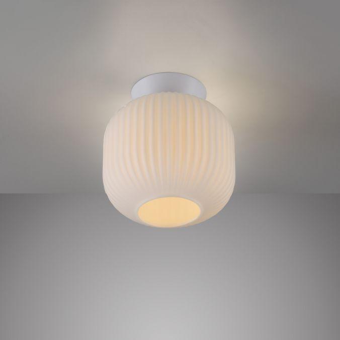 Svítidlo má kulatý tvar s výrazným žebrováním na opálovém skle, které je doplněno bílým kovovým úchytem. Kombinace matného skla a bílé barvy působí nadčasově a snadno se začlení do moderních i skandinávských interiérů. Konstrukce umožňuje montáž na strop i na stěnu.