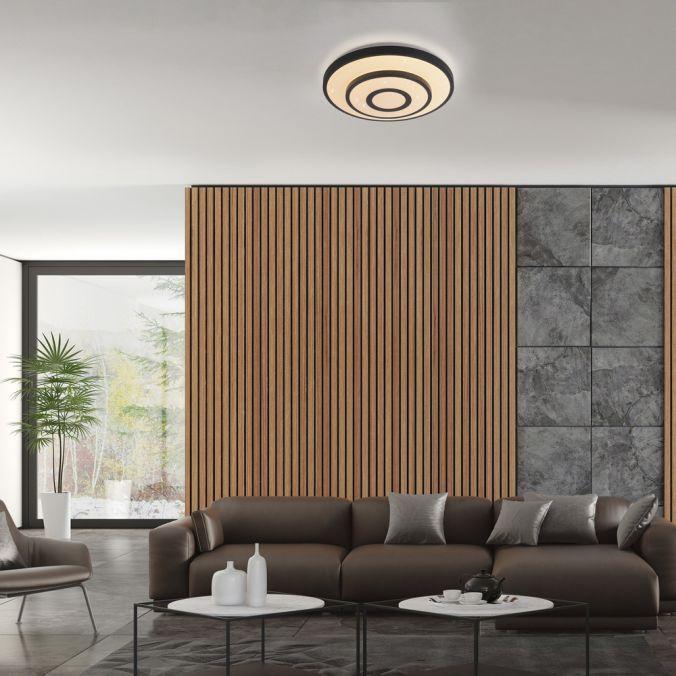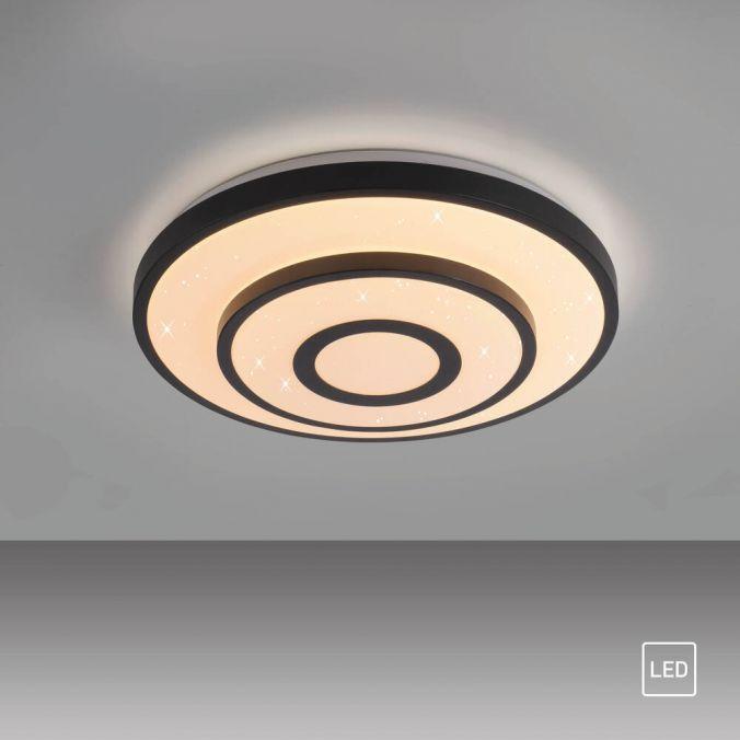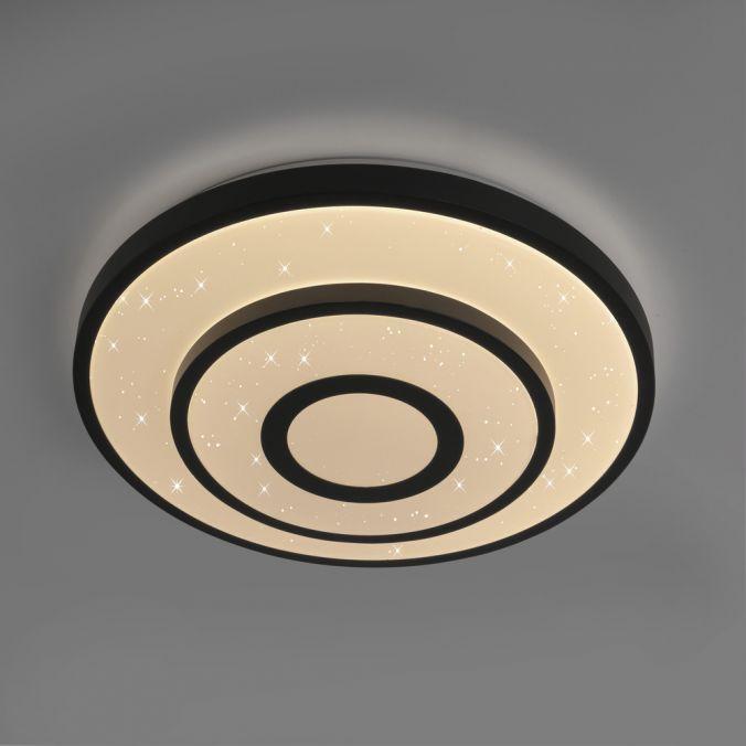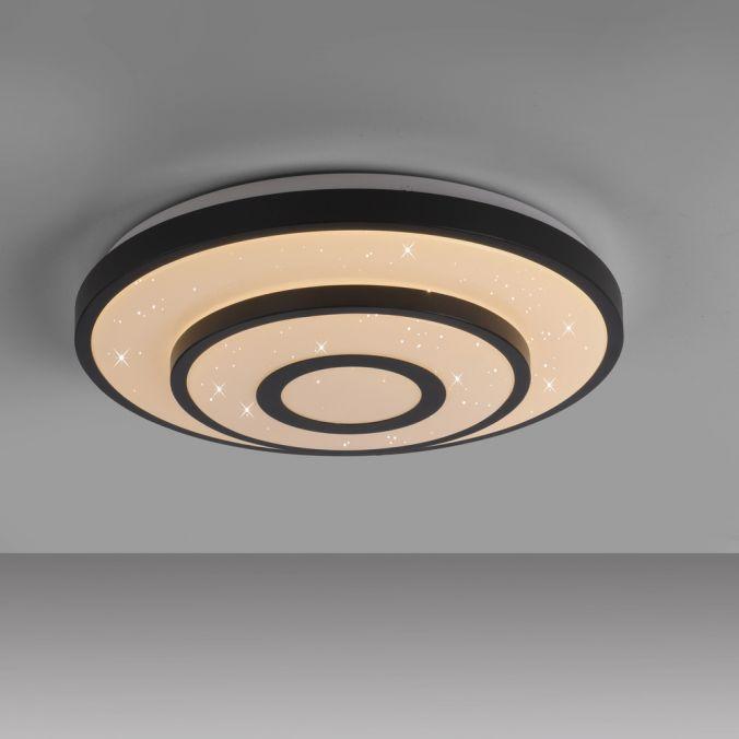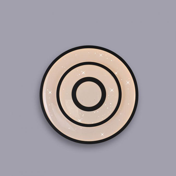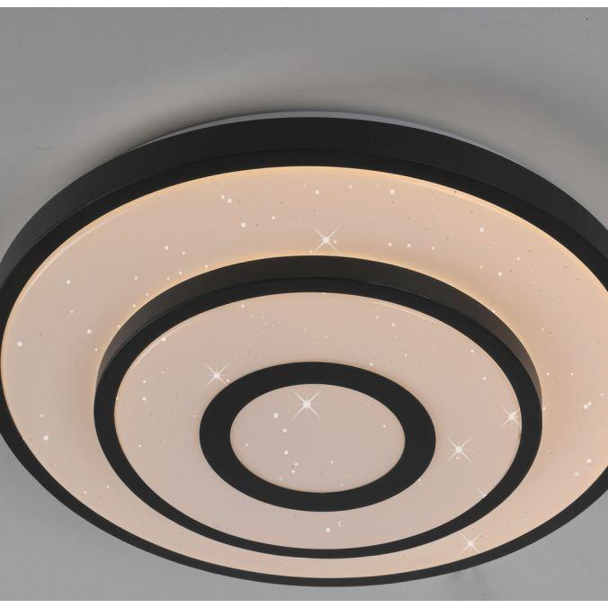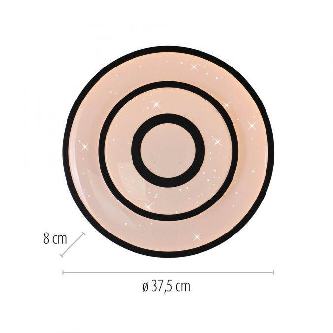 Svítidlo má kulatý tvar s průměrem 375 mm a výškou 80 mm. Kombinace černého kovu a plastu působí elegantně a moderně. Povrch svítidla je zdoben drobnými světelnými body, které vytvářejí efekt hvězdného nebe. Celkový vzhled je nadčasový a snadno zapadne do současných interiérů.