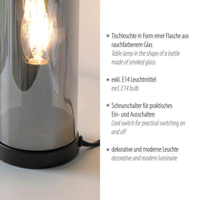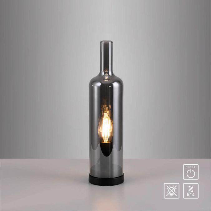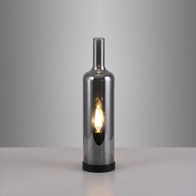 Lampa má tvar láhve z kouřového skla, které elegantně rozptyluje světlo a zároveň chrání žárovku před přímým pohledem. Černý podstavec doplňuje moderní vzhled a zajišťuje stabilitu. Celkový design je minimalistický, vhodný do moderních i klasických interiérů.