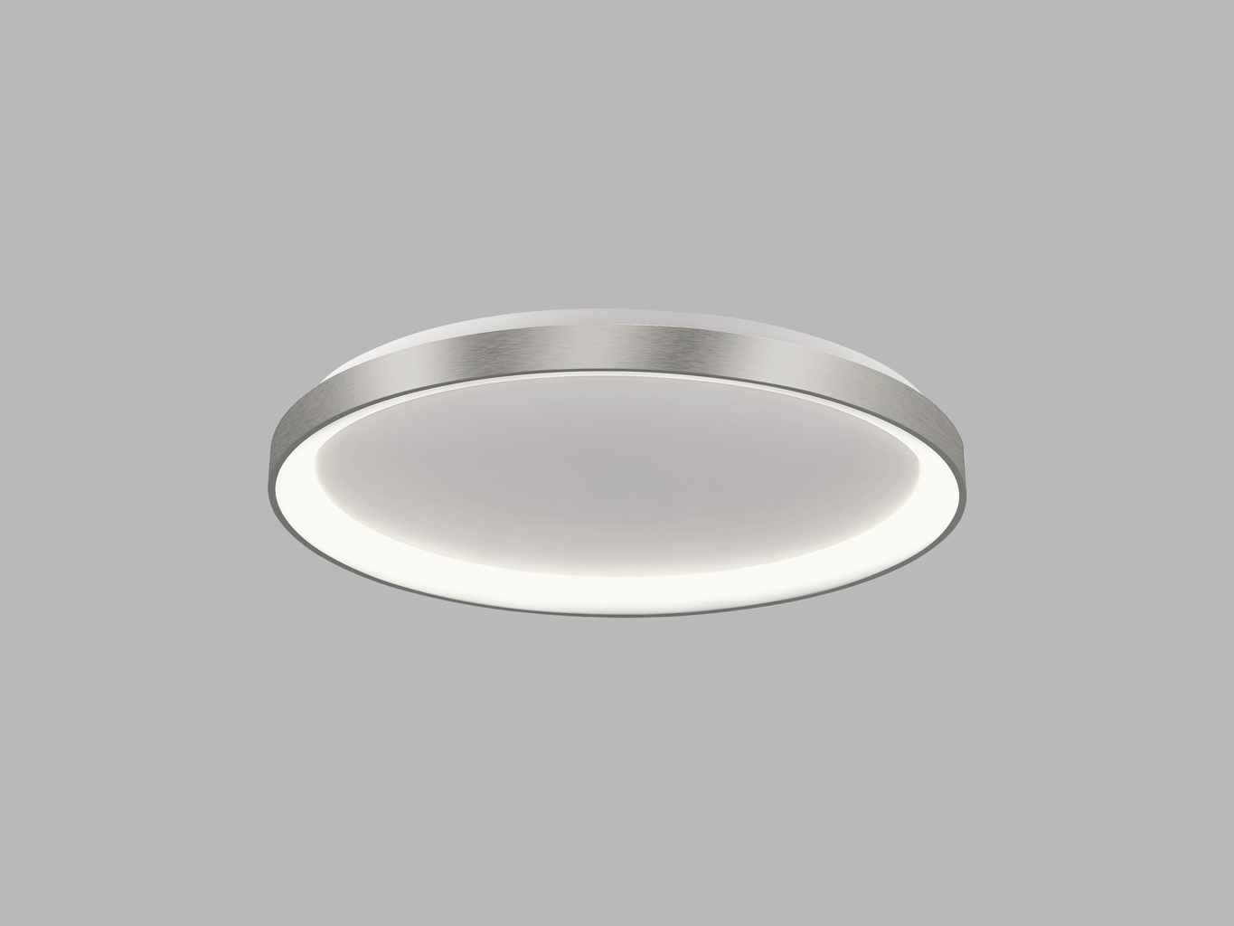 Svítidlo má jednoduchý a elegantní kruhový tvar s průměrem 780 mm a výškou 60 mm. Rám je z hliníku v matném niklovém provedení, difuzor z opálového PMMA zajišťuje jemné rozptýlení světla bez oslnění. Minimalistický design se hodí do moderních i klasických interiérů.