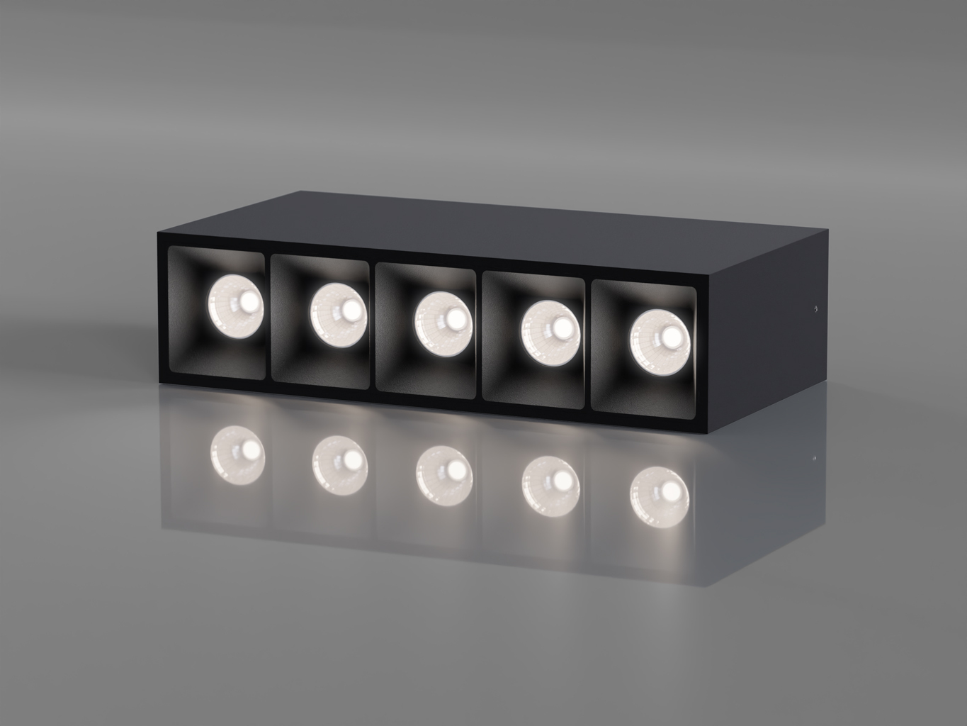 Světlo má hranatý, lineární tvar s pěti samostatnými reflektory. Tělo je vyrobeno z hliníku v černé barvě (RAL 9005), spodní část tvoří polykarbonátový reflektor. Minimalistický design působí technicky a elegantně, snadno zapadne do moderních i komerčních interiérů.