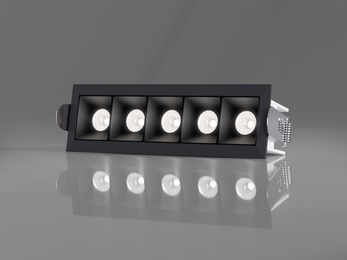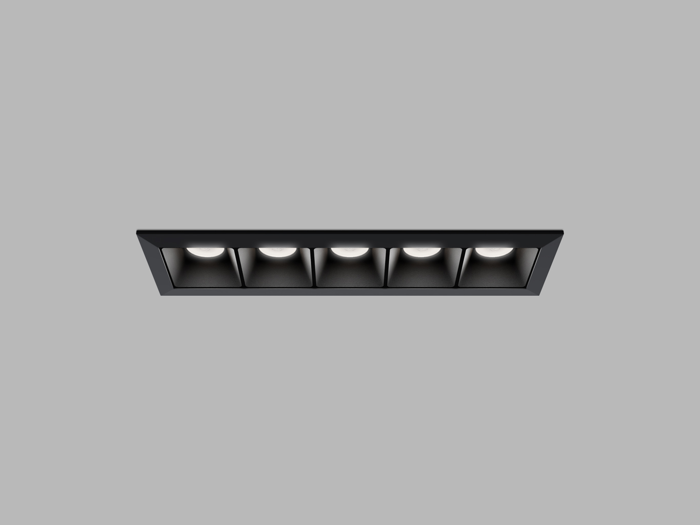 Svítidlo má úzký obdélníkový tvar s pěti samostatnými LED segmenty, které jsou zapuštěné v černém hliníkovém rámu. Reflektor je z polykarbonátu, což zajišťuje odolnost a rovnoměrné rozptýlení světla. Minimalistický design působí elegantně a nenápadně, ideální pro moderní interiéry.