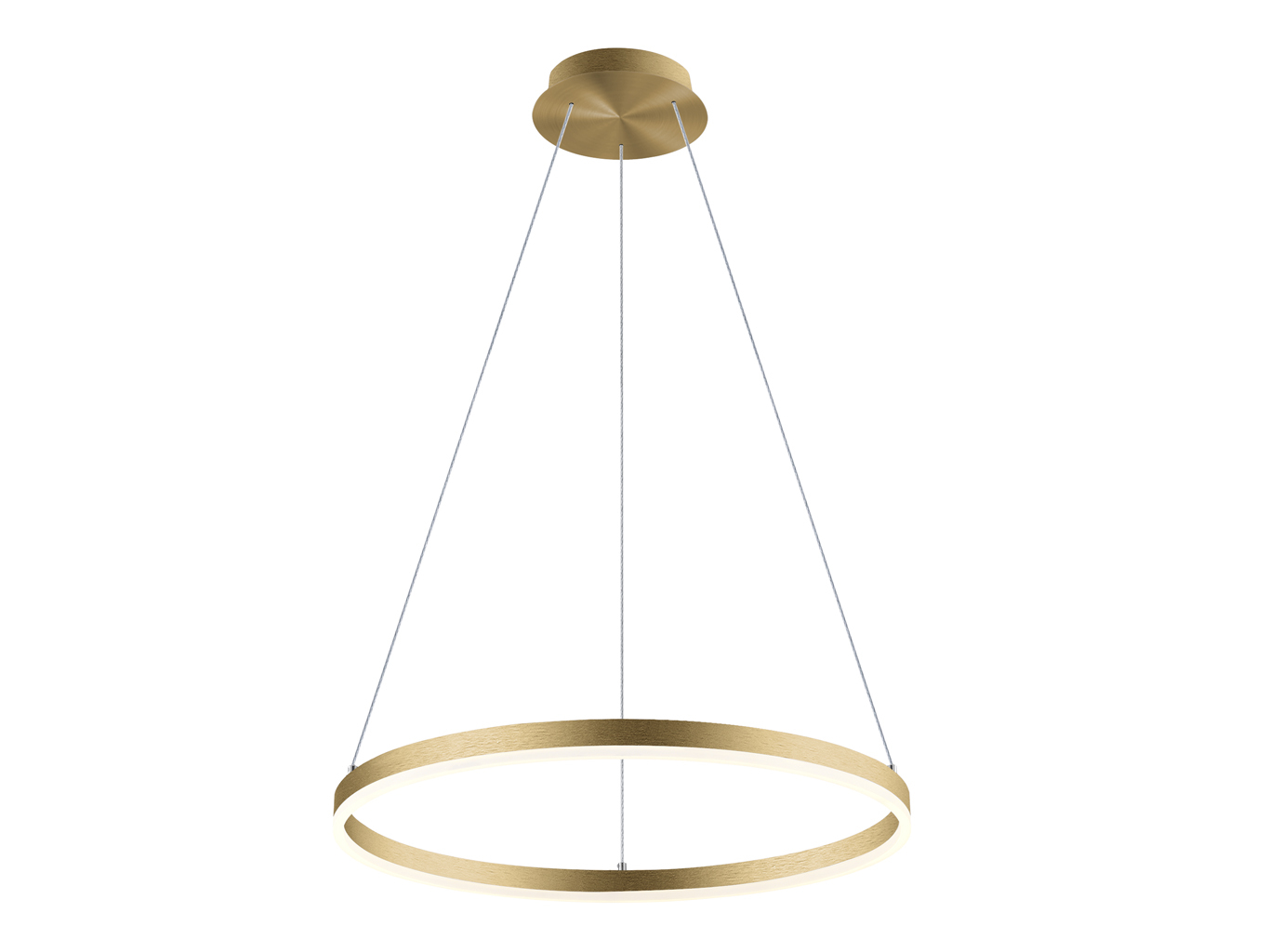 Svítidlo má velmi tenký kruhový profil z hliníku v luxusní zlaté barvě (RAL 1036) a je doplněno opálovým difuzorem z PMMA, který zajišťuje příjemné a rovnoměrné rozptýlené světlo. Minimalistický vzhled podtrhuje subtilní zavěšení na lankách, což dodává celku vzdušnost a eleganci.