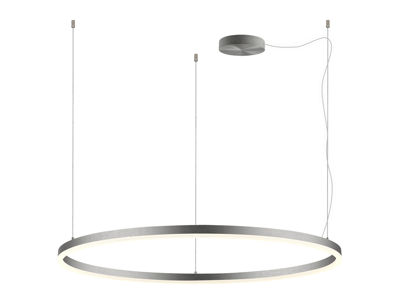 Svítidlo zaujme velmi tenkým, elegantním kruhovým profilem o průměru 1000 mm. Kombinace hliníkového těla v matném niklu a opálového difuzoru z PMMA podtrhuje moderní vzhled a zajišťuje rovnoměrné rozptýlení světla v prostoru. Minimalistické zavěšení na tenkých lankách působí vzdušně a nenápadně.