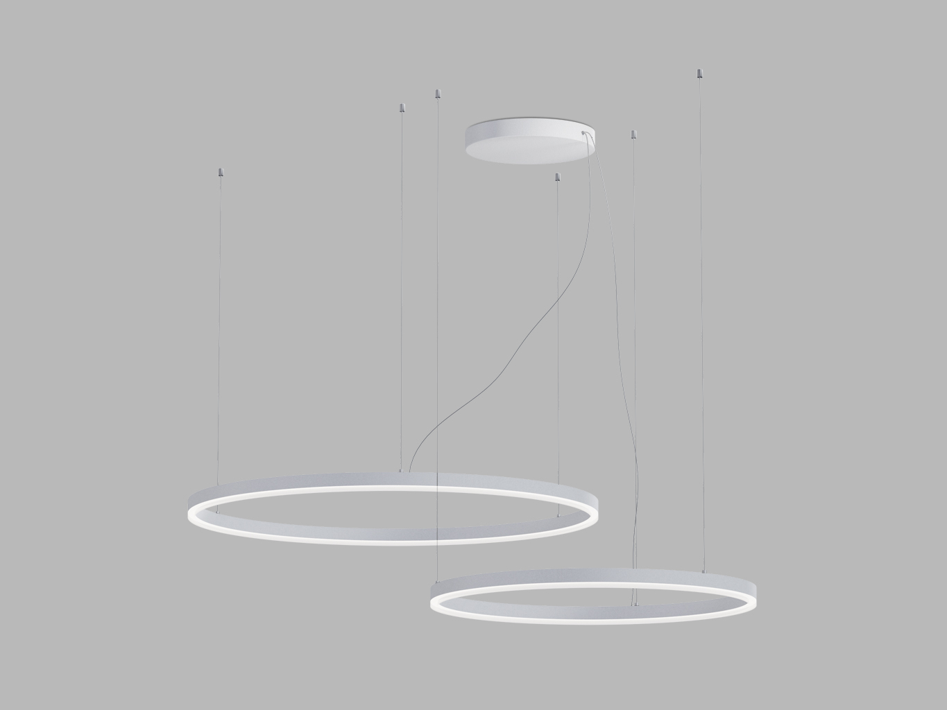 Svítidlo tvoří dva tenké hliníkové kruhy v matné bílé barvě (RAL 9003), doplněné opálovým difuzorem z PMMA. Minimalistický design podtrhuje subtilní zavěšení na lankách, které umožňuje variabilní instalaci v prostoru. Díky čistým liniím a jednoduchému tvaru se svítidlo hodí do moderně zařízených interiérů.