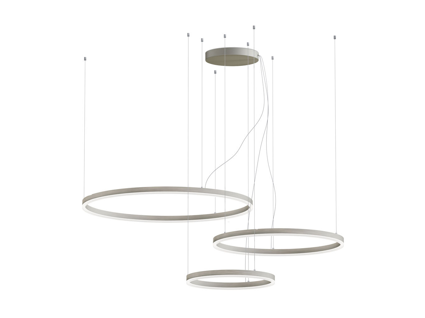 Svítidlo tvoří tři kruhové prvky o průměrech 400, 600 a 800 mm, zavěšené na tenkých lankách až do výšky 5 metrů. Konstrukce je z hliníku v matném niklovém provedení, světlo je rozptýleno opálovým difuzorem z PMMA. Minimalistický design podtrhuje čisté linie a subtilní profil, což umožňuje svítidlu vyniknout v moderním prostoru.