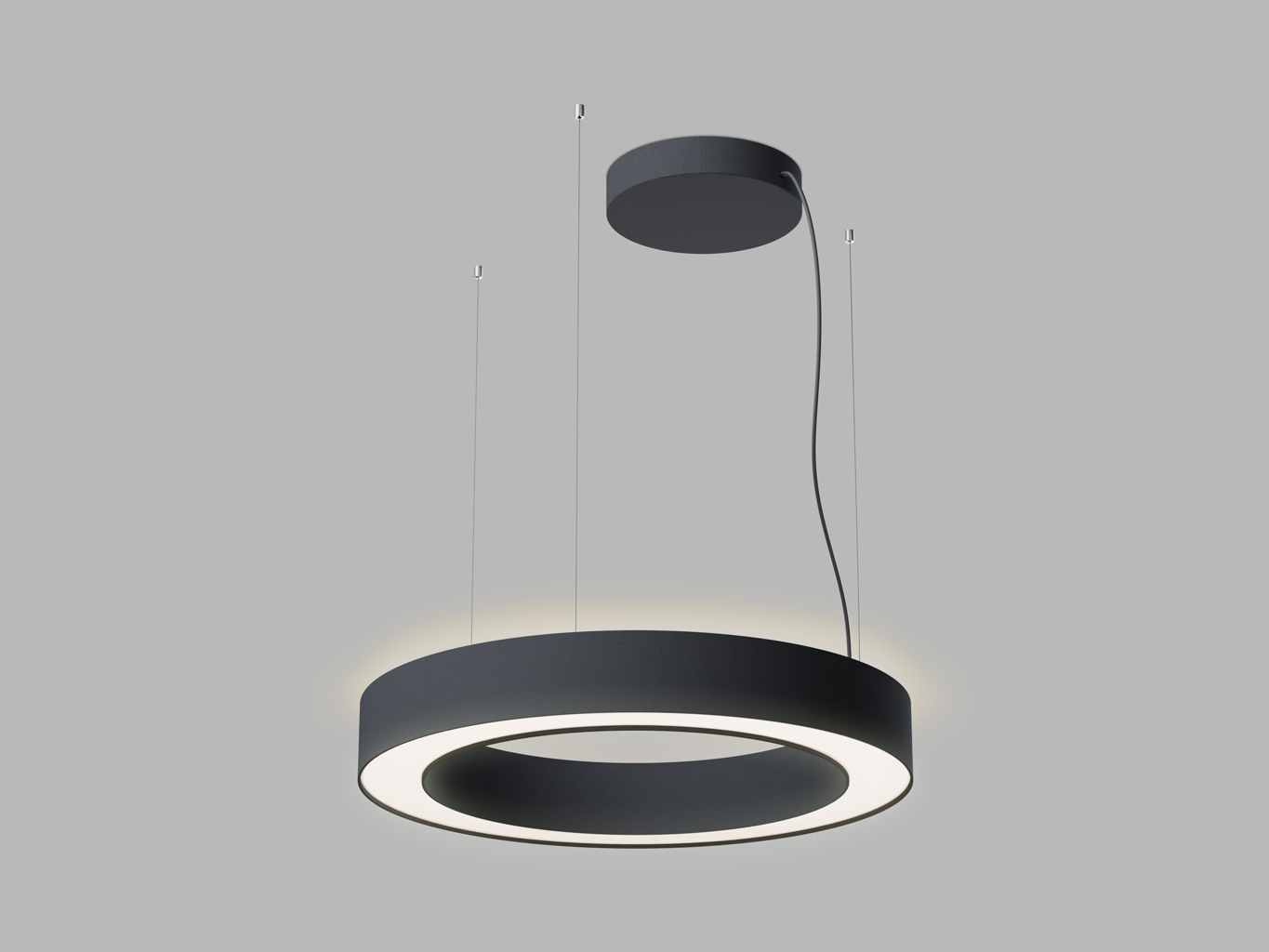 Minimalistický tvar prstence z hliníku v matné černé barvě (RAL 9017) působí nadčasově a decentně. Prizmatický difuzor z PMMA zajišťuje rovnoměrné rozptýlení světla bez oslnění. Svítidlo je zavěšeno na tenkých lankách a díky svému subtilnímu profilu působí lehce v prostoru.