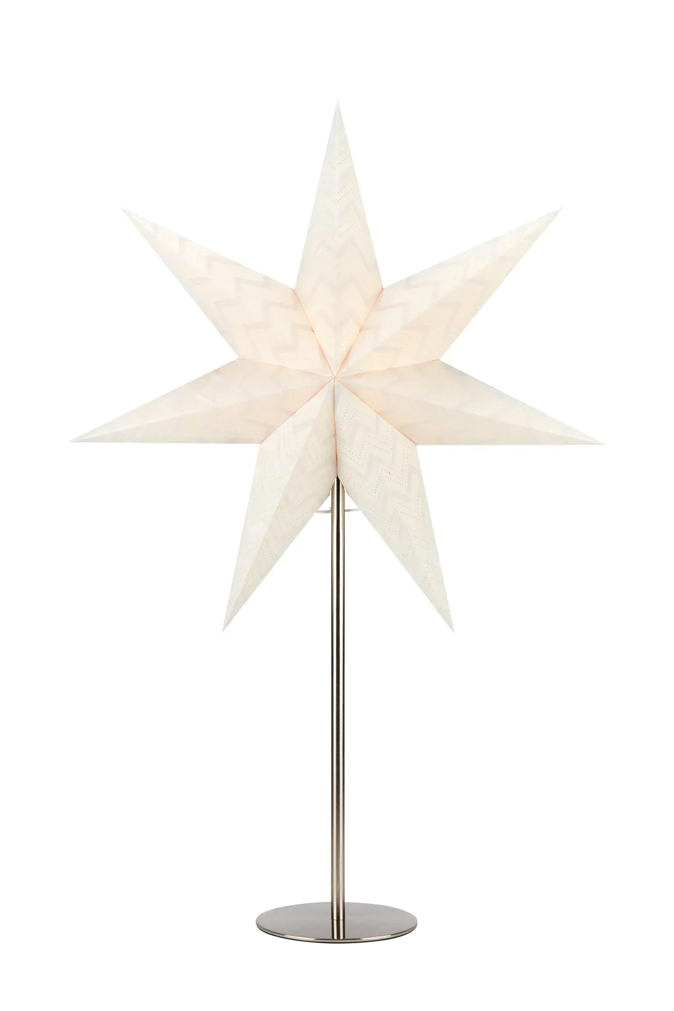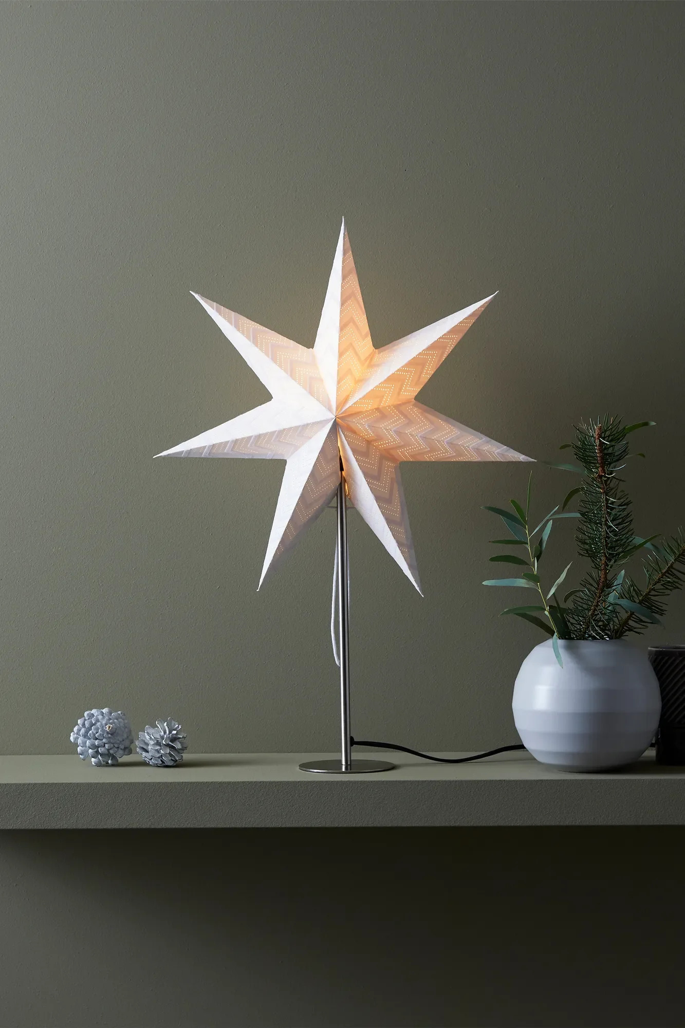 Oživte svůj interiér v době Vánoc ikonickým stolním svítidlem Markslöjd Admira ve tvaru bílé hvězdy. Tento elegantní a nadčasový doplněk kombinuje bíle lakovaný papír s precizně zpracovaným ocelovým podstavcem, což vytváří harmonický kontrast mezi jemností a stabilitou. Díky svému výraznému cik-cak vzoru hvězda působí jemně i v minimalistických prostorách a snadno se stane dominantou vánoční výzdoby stolu, parapetu nebo komody.