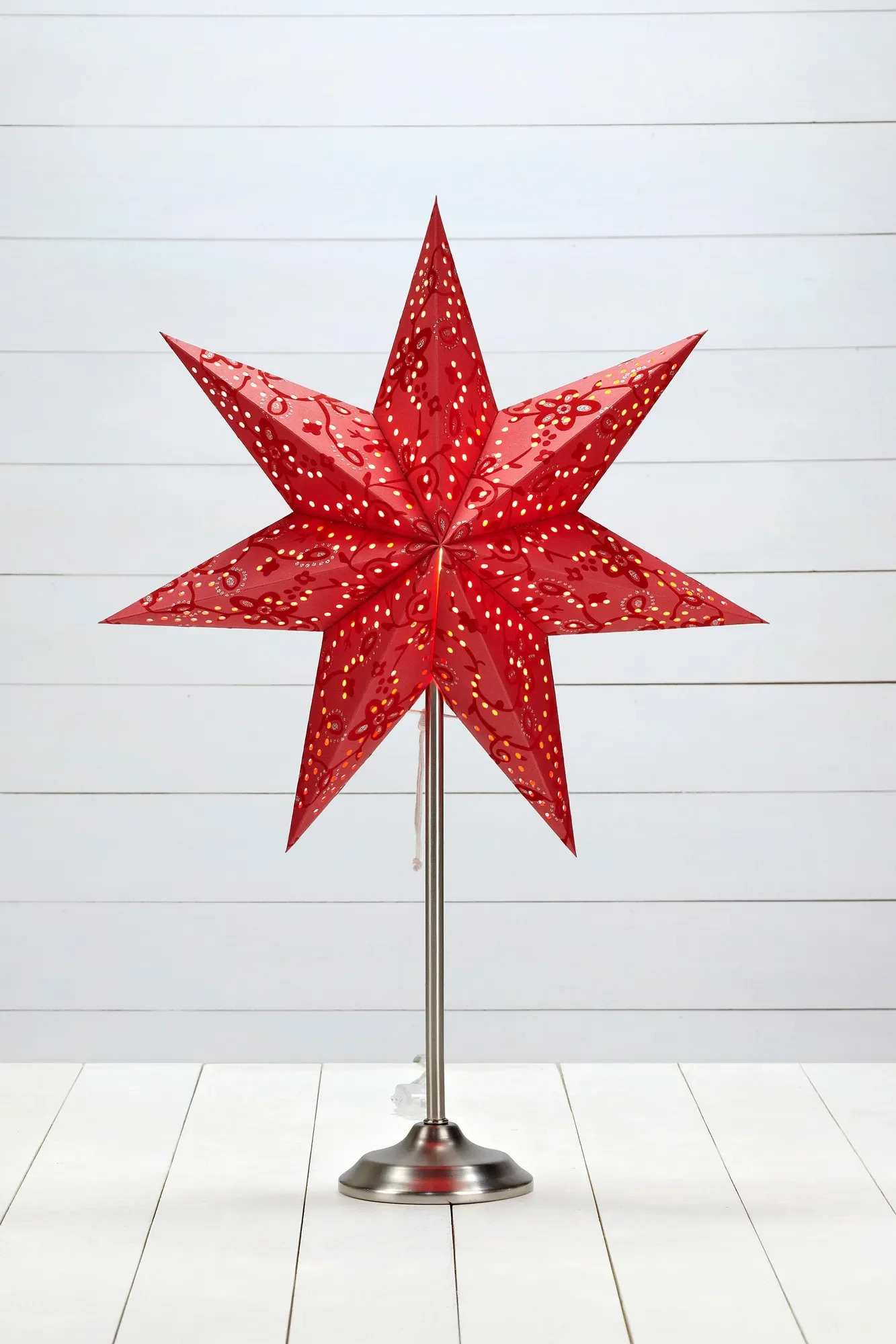 Stolní svítidlo Markslöjd Aratorp v podobě tradiční červené hvězdy je inspirované skandinávskými Vánocemi a vyniká detailně perforovaným papírovým vzorem, který vytváří útulnou atmosféru a jedinečné světelné efekty. Stabilní kovová základna v broušené oceli podtrhuje slavnostní vzhled a zajišťuje bezpečné umístění na parapet, polici či komodu.