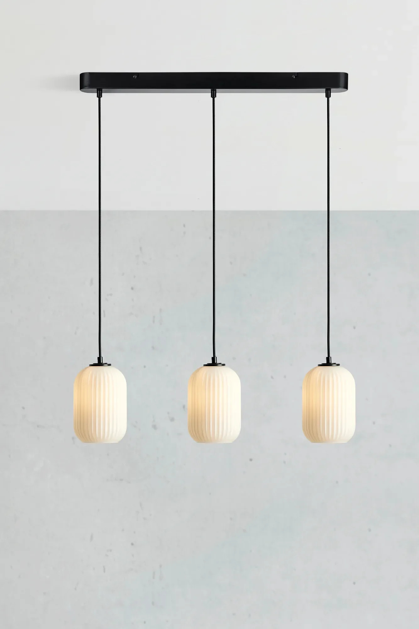 Závěsné svítidlo Markslöjd Cava v černém provedení je perfektní volbou pro osvětlení kuchyňského ostrůvku či jídelního stolu. Kombinace matné černé kovové lišty a tří závěsných opálově bílých žebrovaných stínidel z mléčného skla vytváří nadčasový a elegantní dojem, který vynikne v každém moderním i klasickém interiéru. Důraz na detail a kvalitní zpracování skvěle ladí se severoevropským designem.