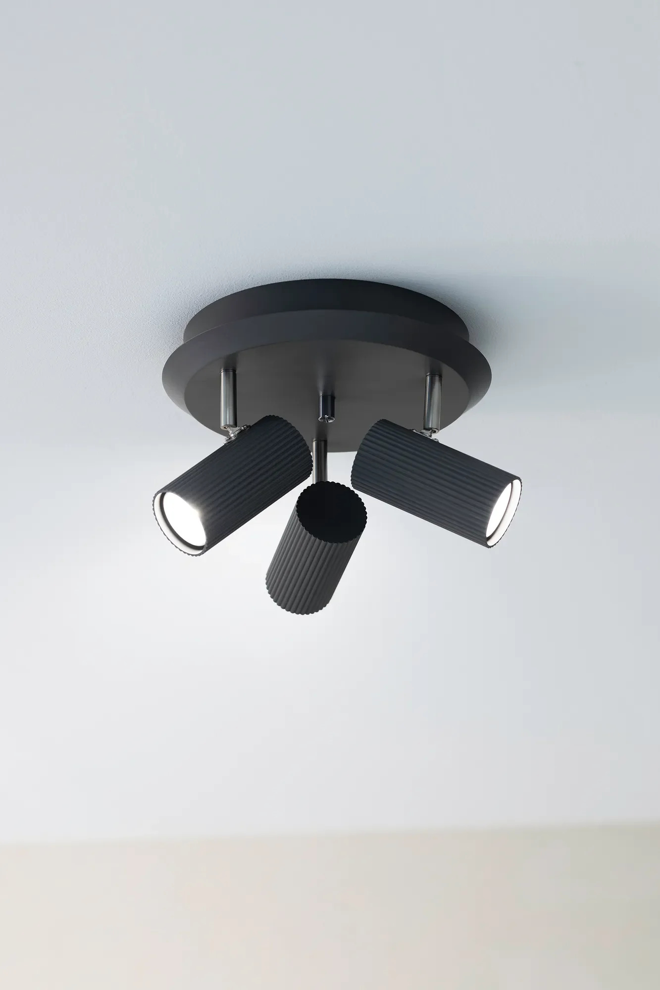 Stropní bodové svítidlo Markslöjd Costilla v tmavě šedé barvě nabízí elegantní a funkční řešení pro osvětlení každé moderní domácnosti. Tři otočné reflektory umožňují individuální nasměrování světla přesně tam, kde ho potřebujete – ideální do předsíně, kuchyně, pracovny či technických místností. Minimalistický design v kombinaci s žebrovaným kovem působí nadčasově a přirozeně zapadne do většiny interiérů.