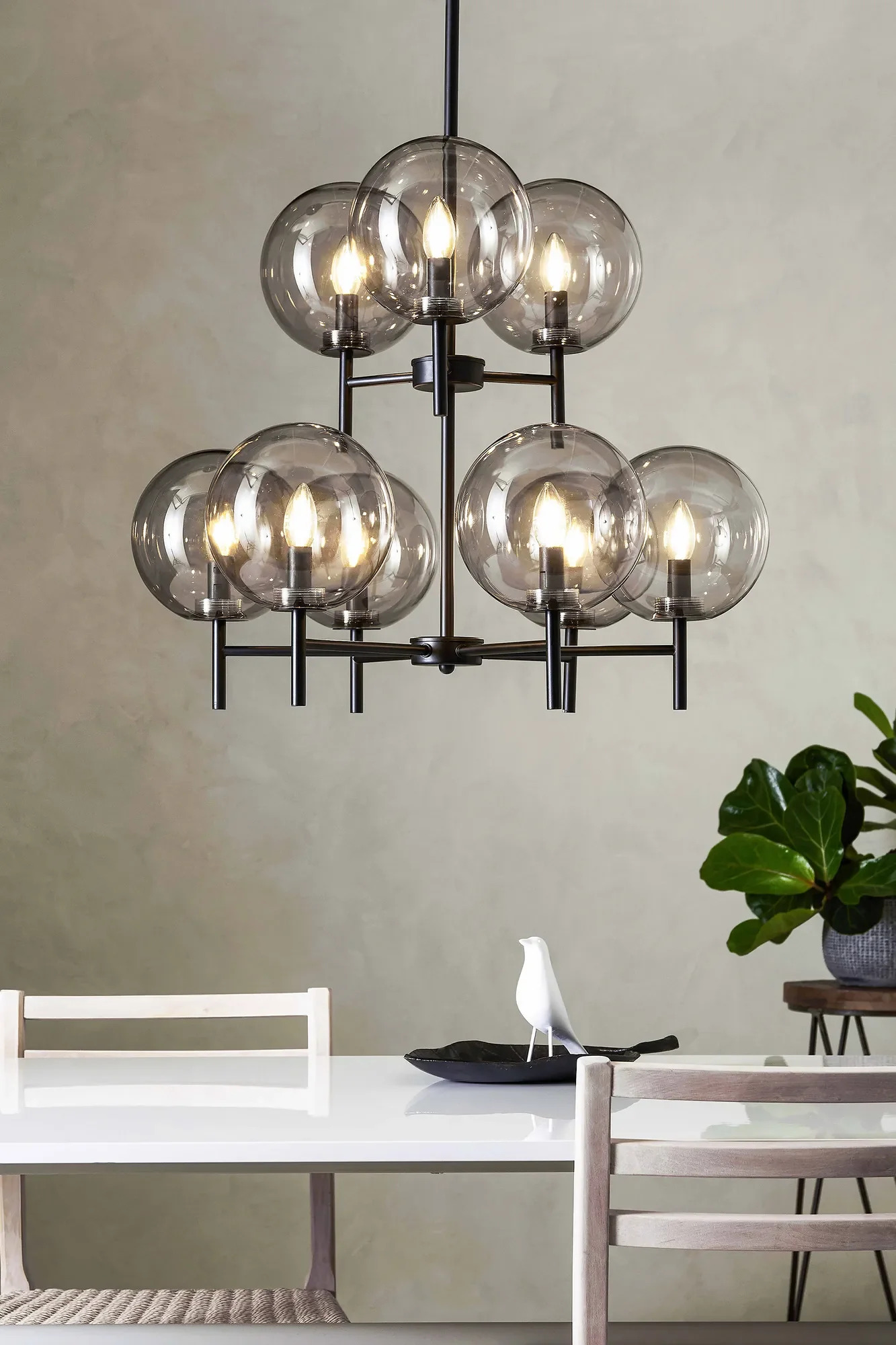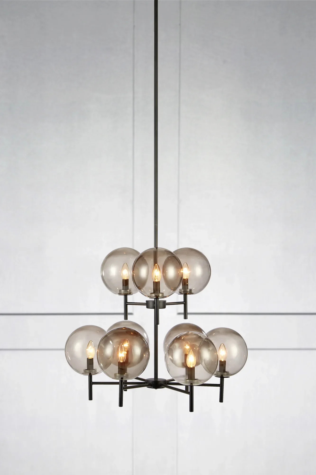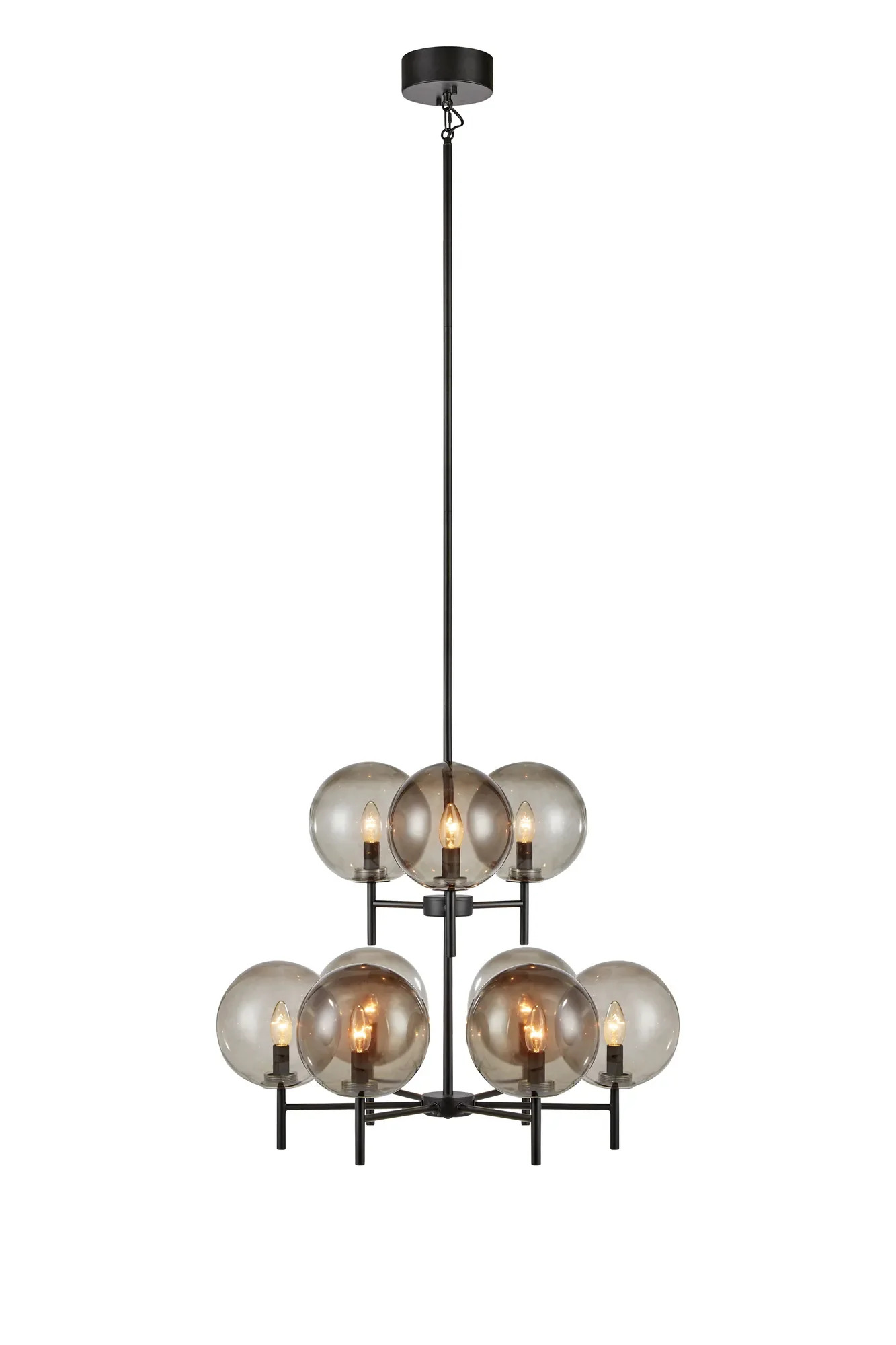• Moderní design: Černá konstrukce v kontrastu s velkými kouřovými skleněnými koulemi