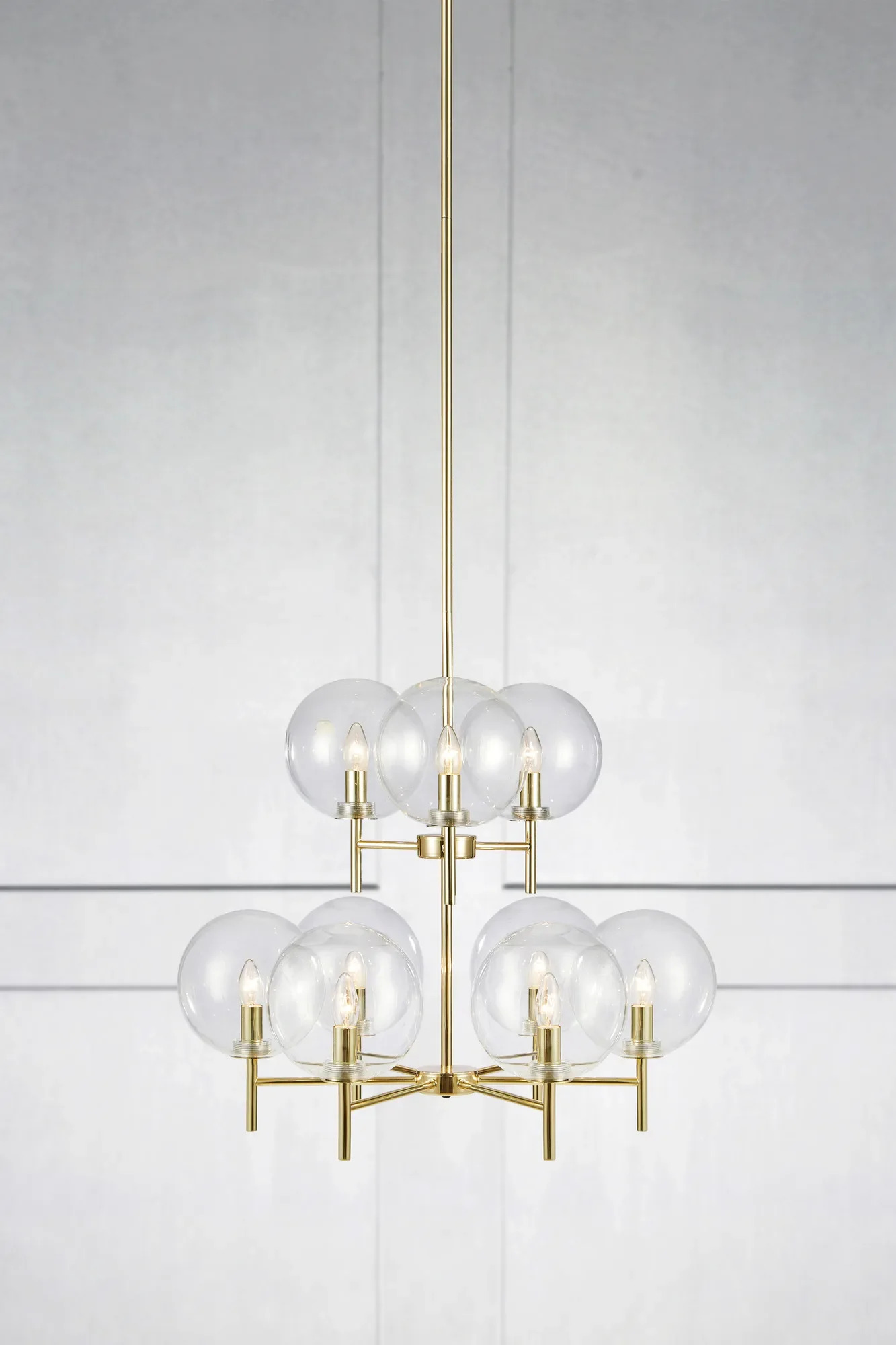 Doporučujeme použít kvalitní LED žárovky s teplým bílým světlem (2700–3000 K), které zvýrazní zlatavé tóny mosazi a zároveň vytvoří příjemnou atmosféru. Svítidlo je ideální instalovat do místností s vyšším stropem, kde vynikne jeho architektonická kompozice.