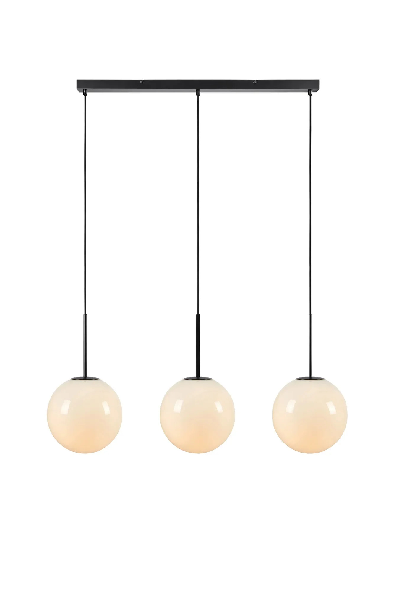 Svítidlo je tvořeno robustní konstrukcí z lakovaného železa, doplněné o matné skleněné stínidla v bílé barvě. Tři světelné body jsou uspořádány v řadě, což zajišťuje rovnoměrné osvětlení celé plochy stolu. Černý textilní kabel s délkou 150 cm umožňuje flexibilní zavěšení přesně podle potřeb vašeho prostoru.