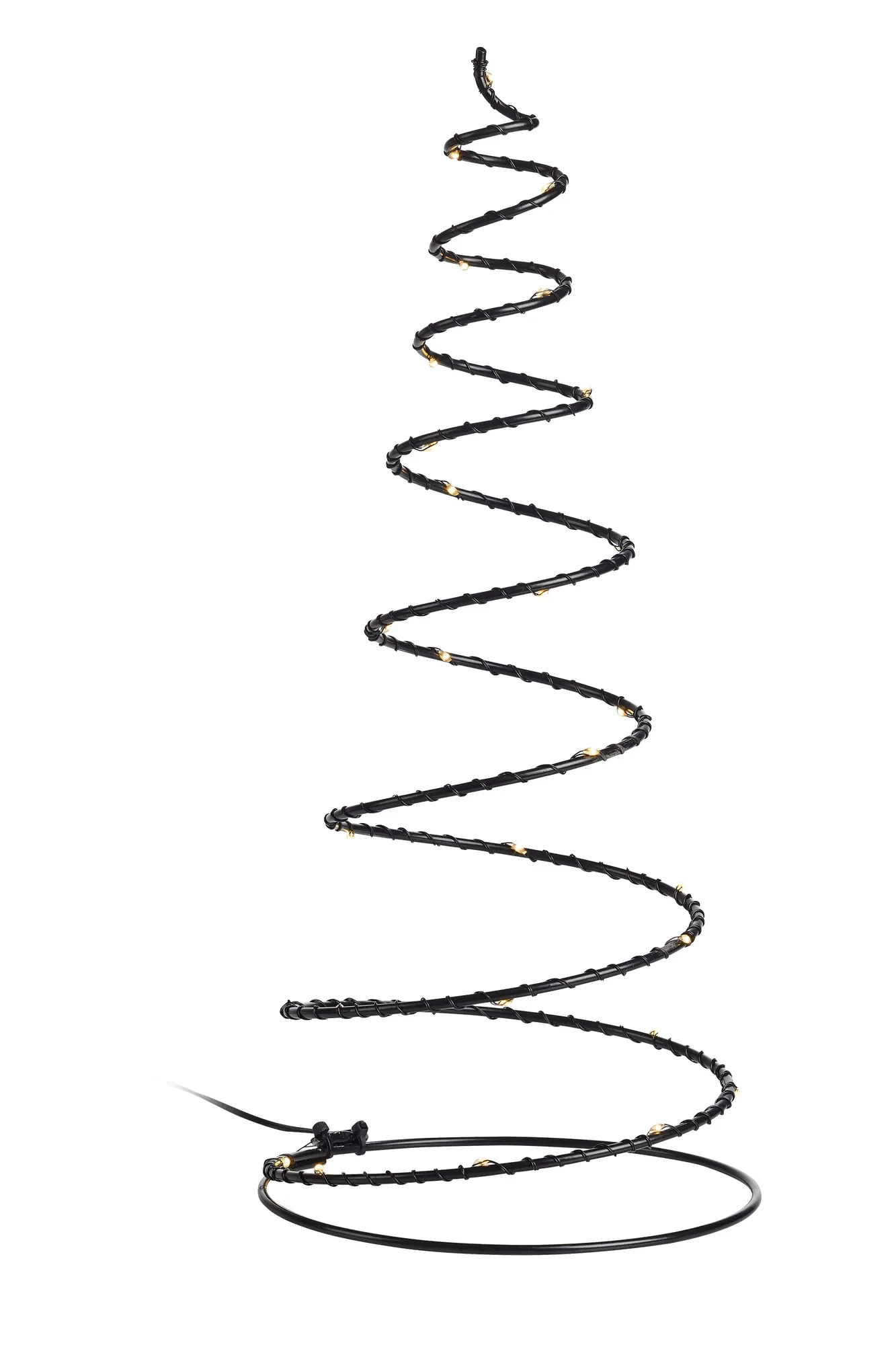 Gullabo zaujme okamžitě jednoduchým, ale přesto poutavým tvarem – černý kovový rám je veden do elegantní spirály, která evokuje siluetu stromku. Veškerý dojem podtrhuje decentní LED světelný řetěz s 30 diodami, které září příjemným teplým bílým světlem. Výška dekorace je 35 cm, šířka a délka základny 15 cm, což z ní činí ideální volbu na sváteční stůl, komodu nebo parapet.