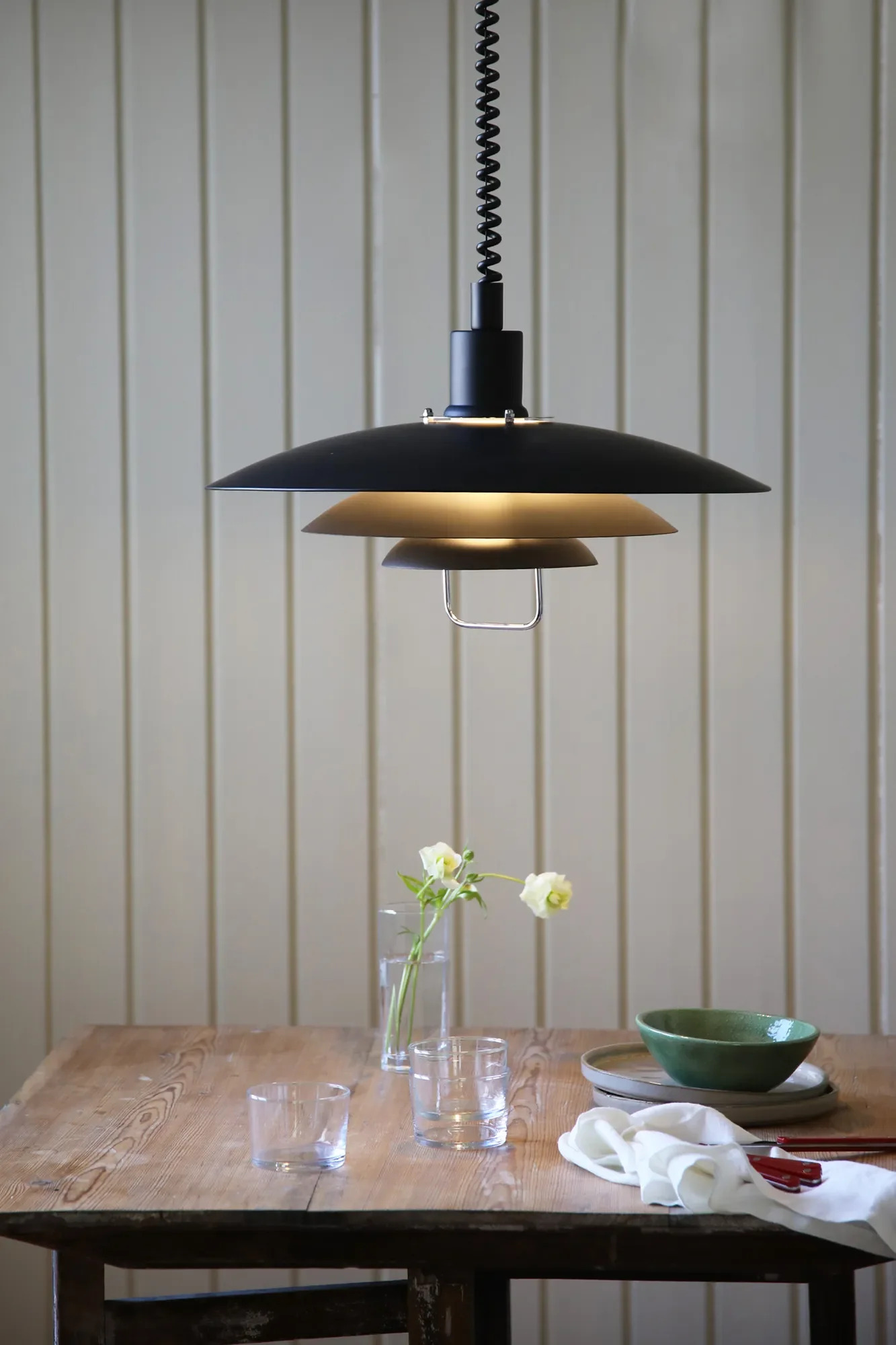 Závěsné svítidlo Markslöjd Kirkenes představuje dokonalou kombinaci funkčnosti a ikonického designu. Jeho černé kovové tělo s chromovanými detaily a charakteristickým stínidlem propůjčuje každému interiéru skandinávskou eleganci i nadčasový vzhled. Díky výškově nastavitelnému závěsu (0,8–1,9 m) se svítidlo perfektně přizpůsobí jídelnímu stolu, kuchyňské lince i obývacímu pokoji.