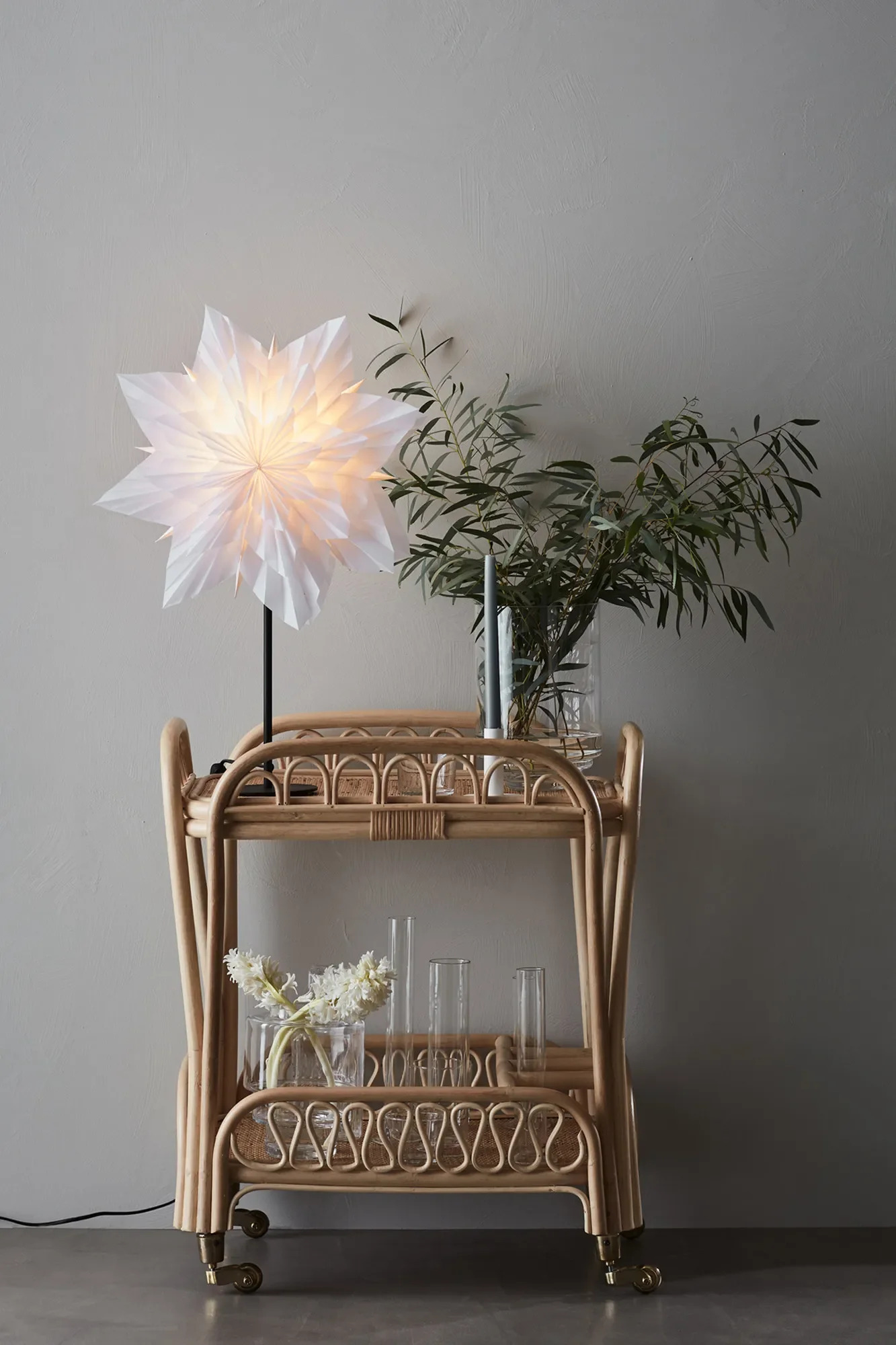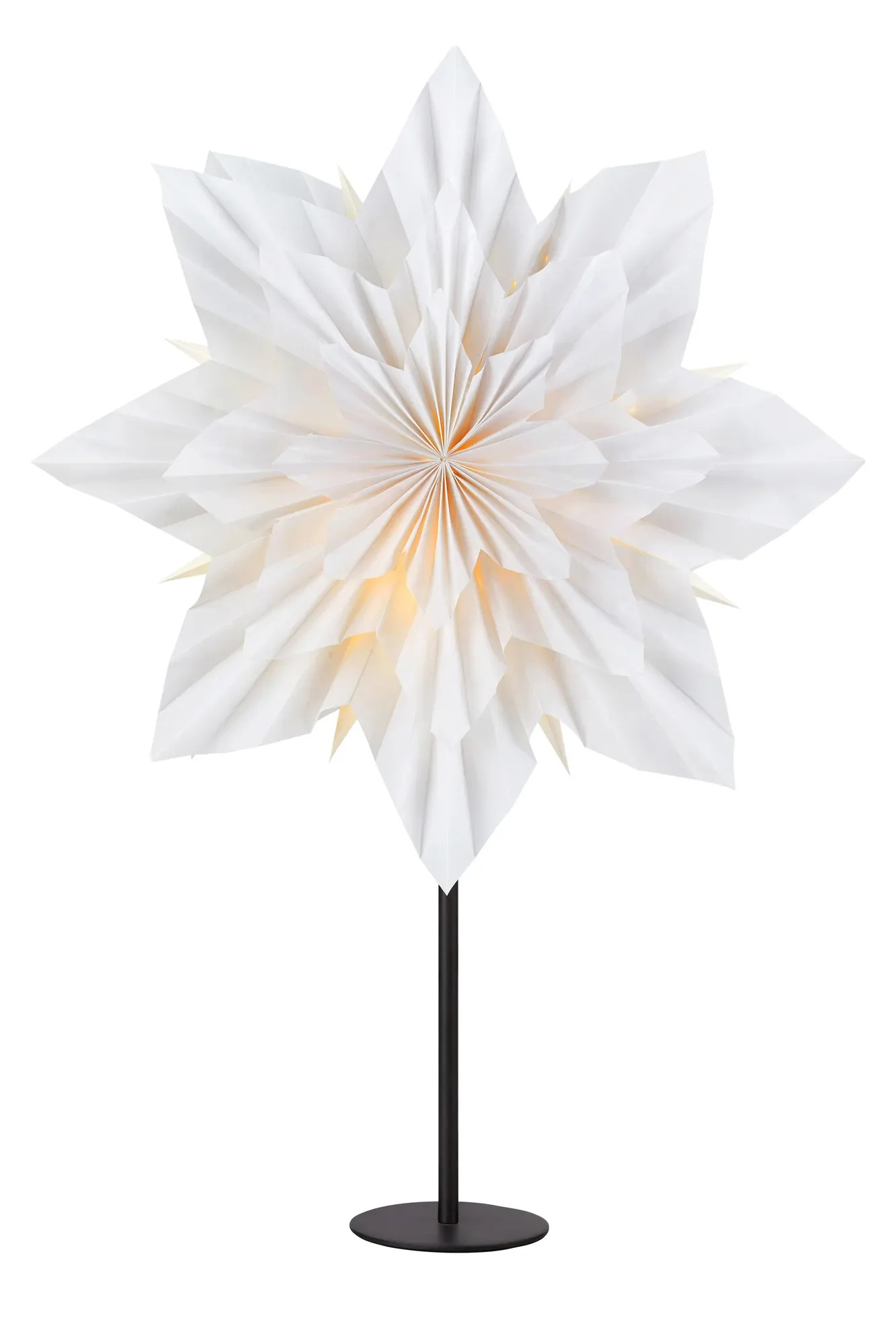 Markslöjd Neela – Bílá papírová hvězda na stůl s černým kovovým podstavcem