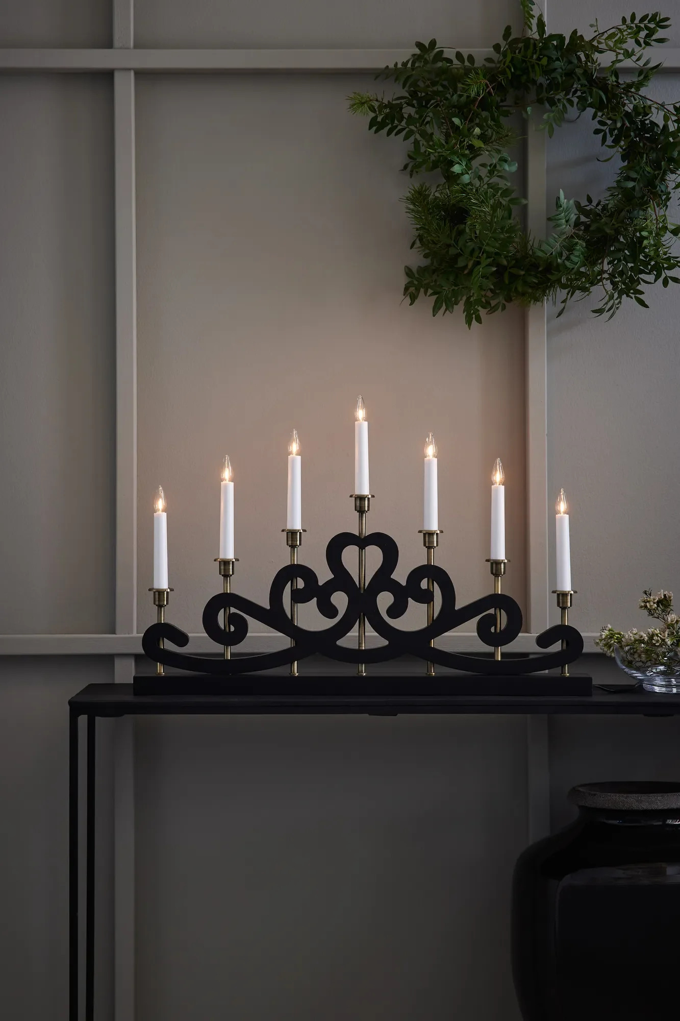Výška: 405 mm, Šířka: 70 mm, Délka: 620 mm, Hmotnost: 1900 g, Příkon: 21 W, Počet světelných zdrojů: 7, Barva světla: teplá bílá, Krytí: IP20, Napětí: 220-240V, Patice: E10, Barva: černá, Materiál: kov/dřevo, Kolekce: NIGHTFALL
