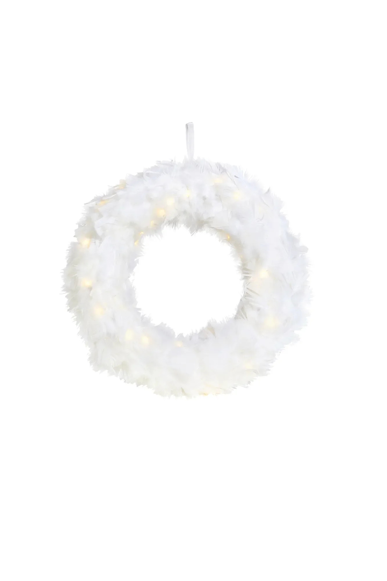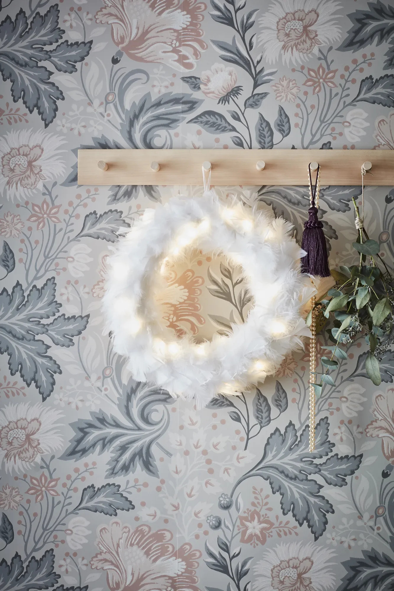 Kombinace bílých peříček a teplých bílých LED diod vytváří dojem lehkosti a čistoty. Věnec působí nenápadně elegantně a hodí se nejen pro sváteční období, ale i jako celoroční doplněk pro interiéry laděné do světlých nebo přírodních tónů.