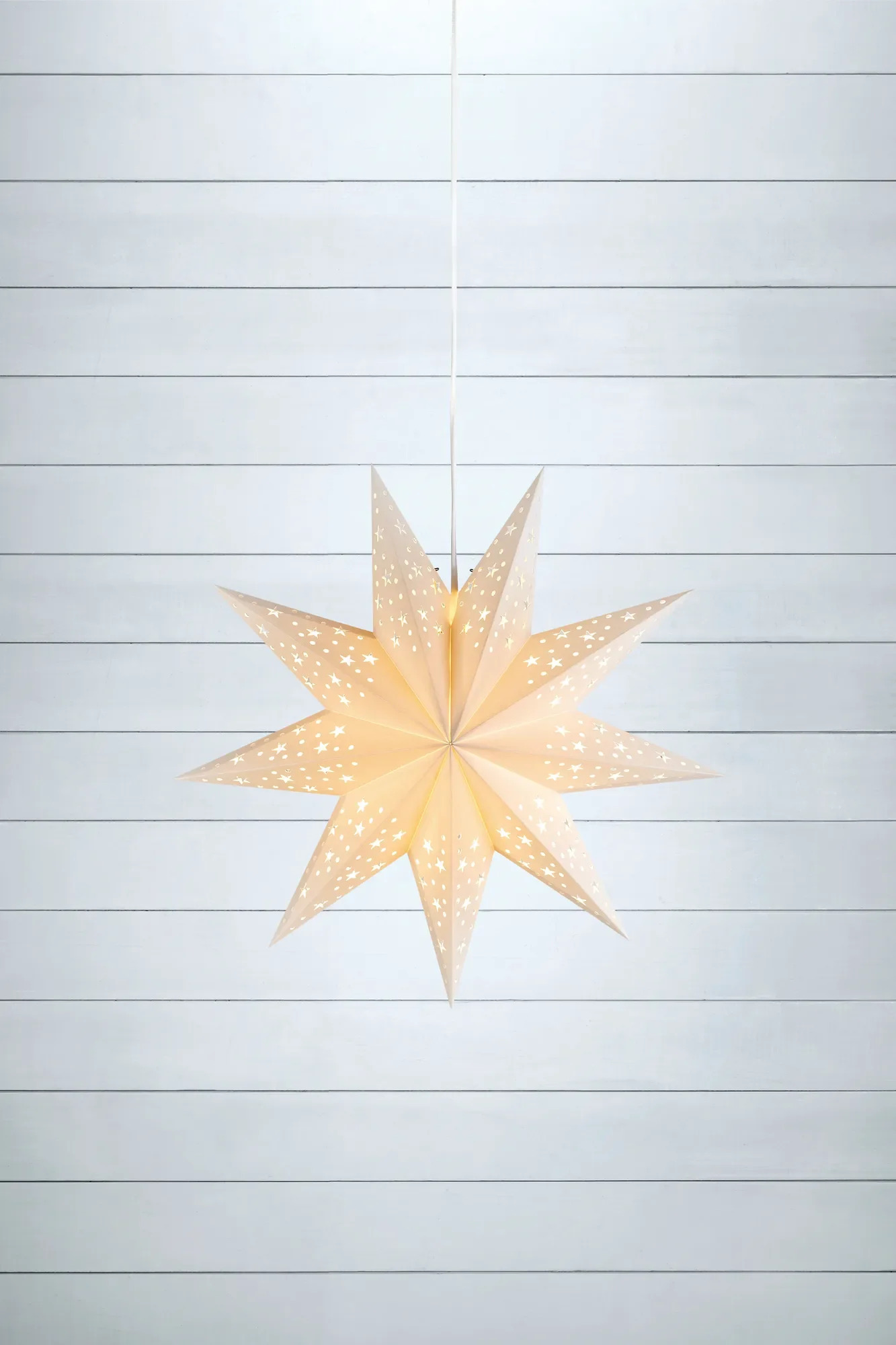 Solvalla je vyrobena z kvalitního bílého papíru, který je lehký, ale zároveň pevný. Hvězda o průměru 45 cm působí vzdušně a díky svým detailním výřezům ve tvaru hvězdiček a puntíků kouzelně rozptyluje světlo po místnosti. Minimální hmotnost (pouze 0,15 kg) umožňuje snadné zavěšení do oken, nad jídelní stůl nebo do dětského pokoje.